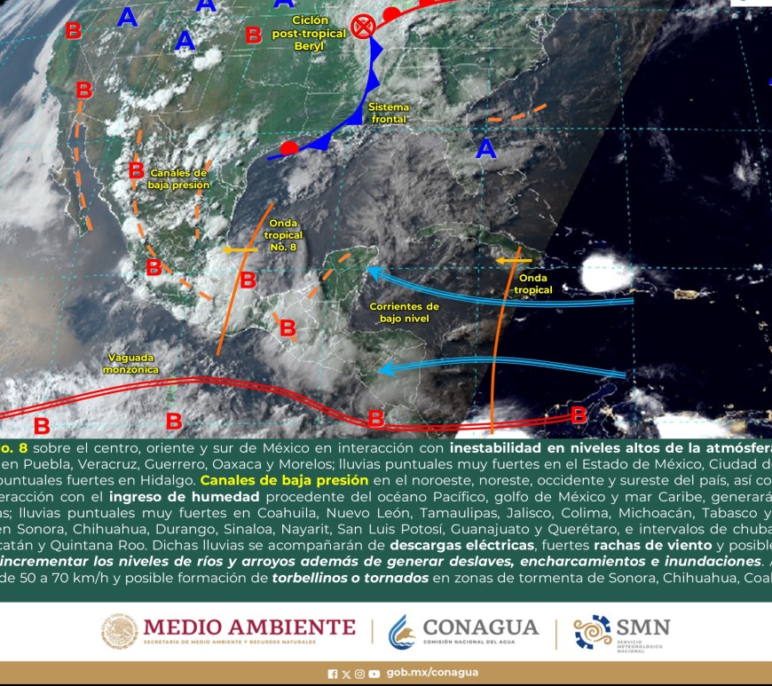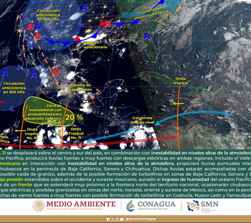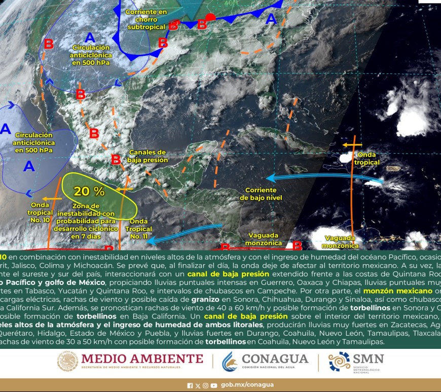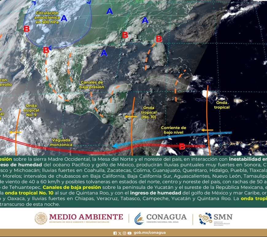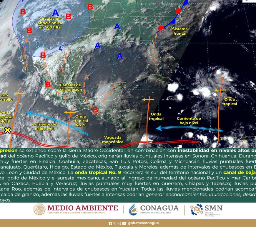 Cielo medio nublado a nublado en el transcurso del día. Ambiente frío en zonas serranas de Durango. Nieblas al amanecer en zonas serranas. Por la tarde, lluvias puntuales muy fuertes en Chihuahua, Durango y Zacatecas (sur), y puntuales fuertes en Coahuila, San Luis Potosí y Aguascalientes; las cuales podrían ocasionar encharcamientos, inundaciones y deslaves, así como incremento en los niveles de ríos y arroyos. Intervalos de chubascos … Continúa leyendo Pronóstico Meteorológico 20 de Julio