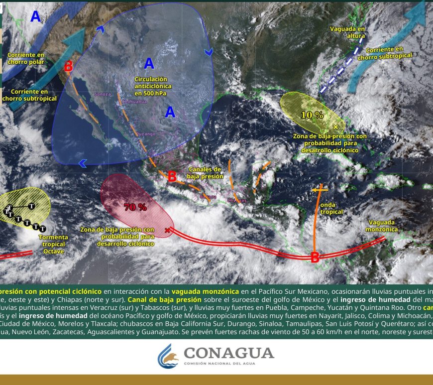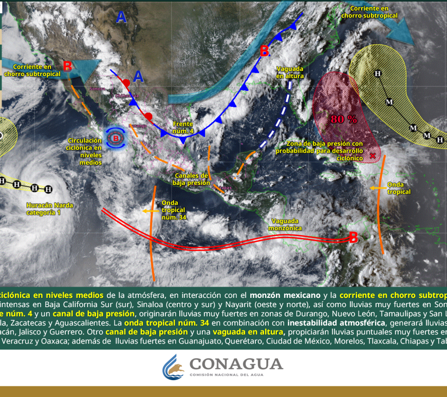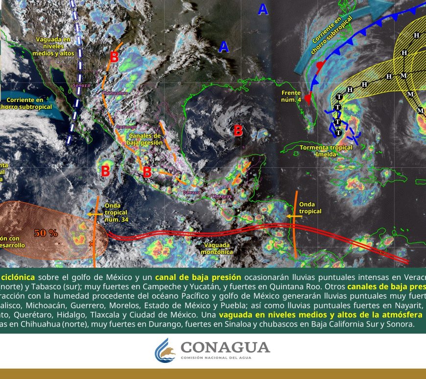 SE PRONOSTICAN LLUVIAS PUNTUALES EXTRAORDINARIAS EN ZONAS DE SAN LUIS POTOSÍ, HIDALGO, PUEBLA Y VERACRUZ En el trascurso del día, cielo medio nublado a nublado. Por la mañana, ambiente fresco, y frio con bancos de niebla en sierras de la región. Durante la tarde, ambiente cálido a caluroso; lluvias puntuales torrenciales en San Luis Potosí (este) y puntuales muy fuertes en Nuevo León; dichas lluvias podrían acompañarse con … Continúa leyendo Pronóstico Meteorológico