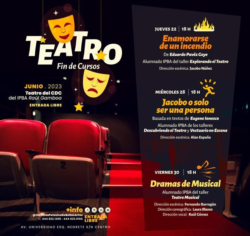 ● La temporada estará compuesta por tres presentaciones montadas por los diferentes talleres del área de Teatro del Instituto Potosino de Bellas Artes. La Secretaría de Cultura de San Luis Potosí, como parte del apoyo que el Gobierno del Estado brinda a nuevos talentos, presenta la temporada de obras de fin de cursos del área de Teatro del Instituto Potosino de Bellas Artes, y que … Continúa leyendo Presentan obras de fin de cursos en el IPBA, entrada libre.