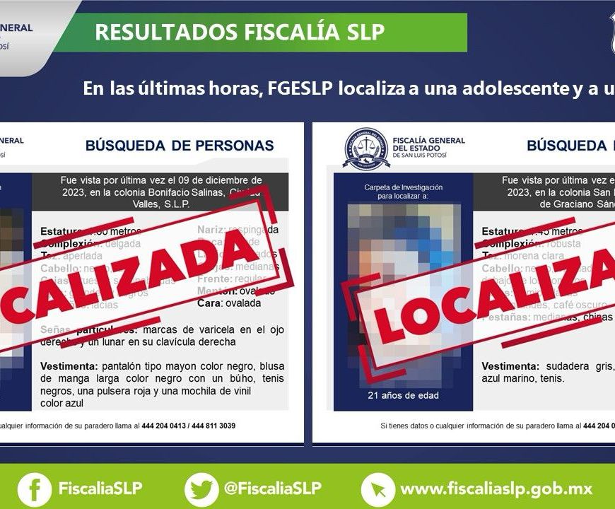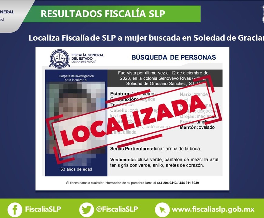 Su ausencia fue reportada el 12 de diciembre de 2023 en la colonia Genovevo Rivas Guillén La Fiscalía General del Estado de San Luis Potosí (FGESLP) informó que Oliva, una mujer de 53 años, quien fue reportada como no localizada en Soledad de Graciano Sánchez, fue encontrada sana y salva. La última ocasión que la familia tuvo contacto con ella fue el 12 de diciembre … Continúa leyendo Fiscalía de SLP informa localización de una mujer buscada en SGS
