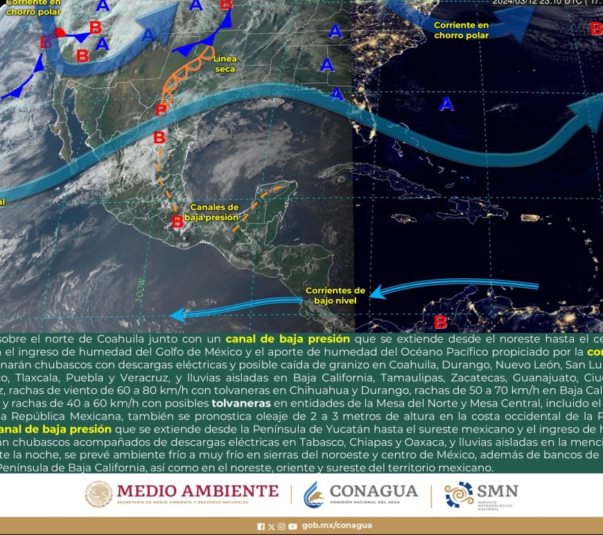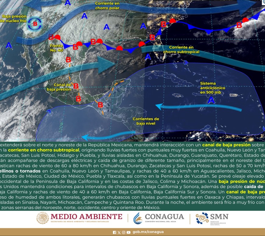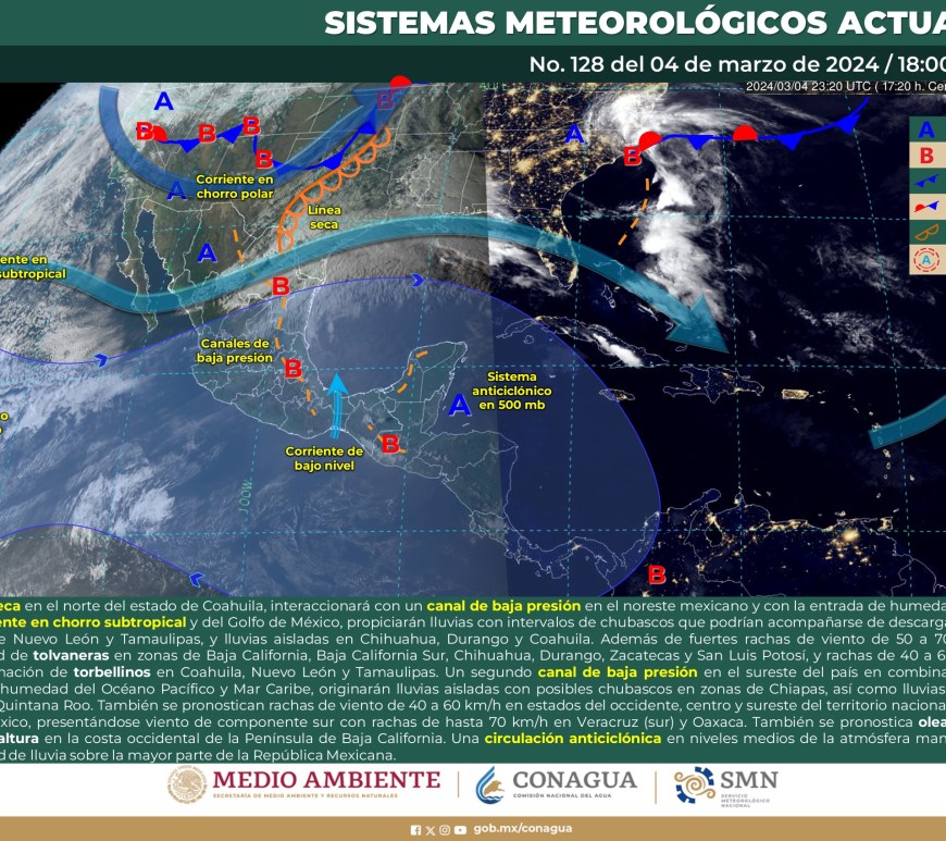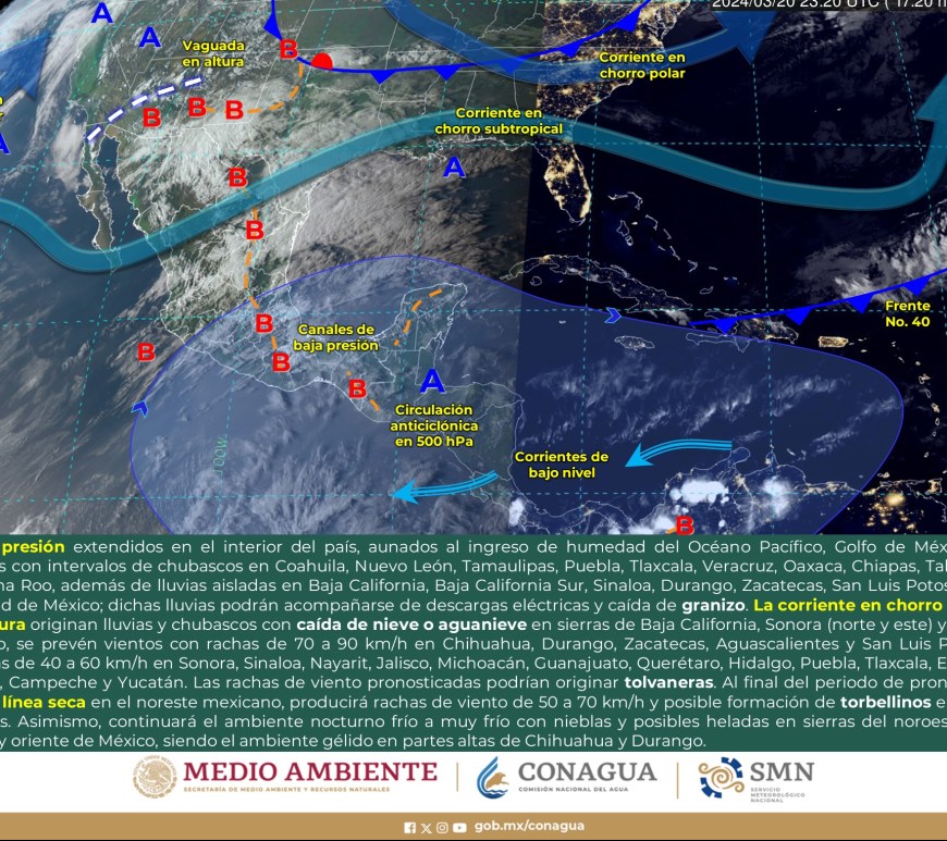 Cielo nublado con lluvias puntuales fuertes en Nuevo León, intervalos de chubascos en Coahuila y lluvias aisladas en San Luis Potosí; las lluvias fuertes podrían acompañarse de descargas eléctricas y posible caída de granizo. Sin lluvia en le resto de la región. Ambiente matutino frío, así como gélido con heladas al amanecer en sierras de Chihuahua, Coahuila y Durango. Bancos de niebla en zonas montañosas. Ambiente cálido … Continúa leyendo Pronóstico Meteorológico 21 de Marzo