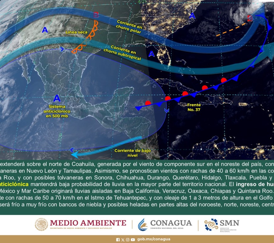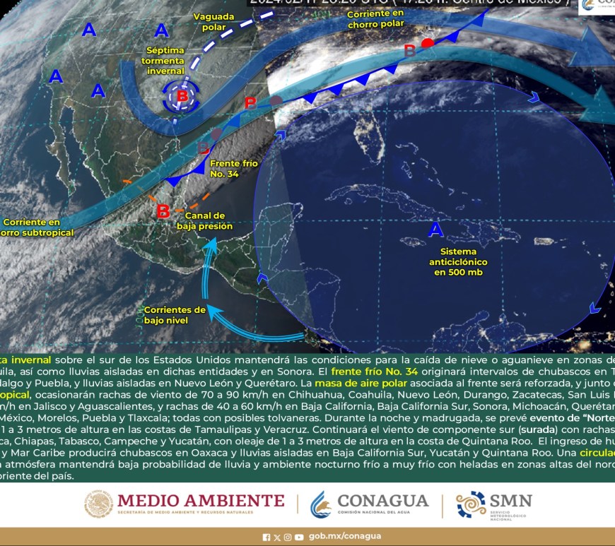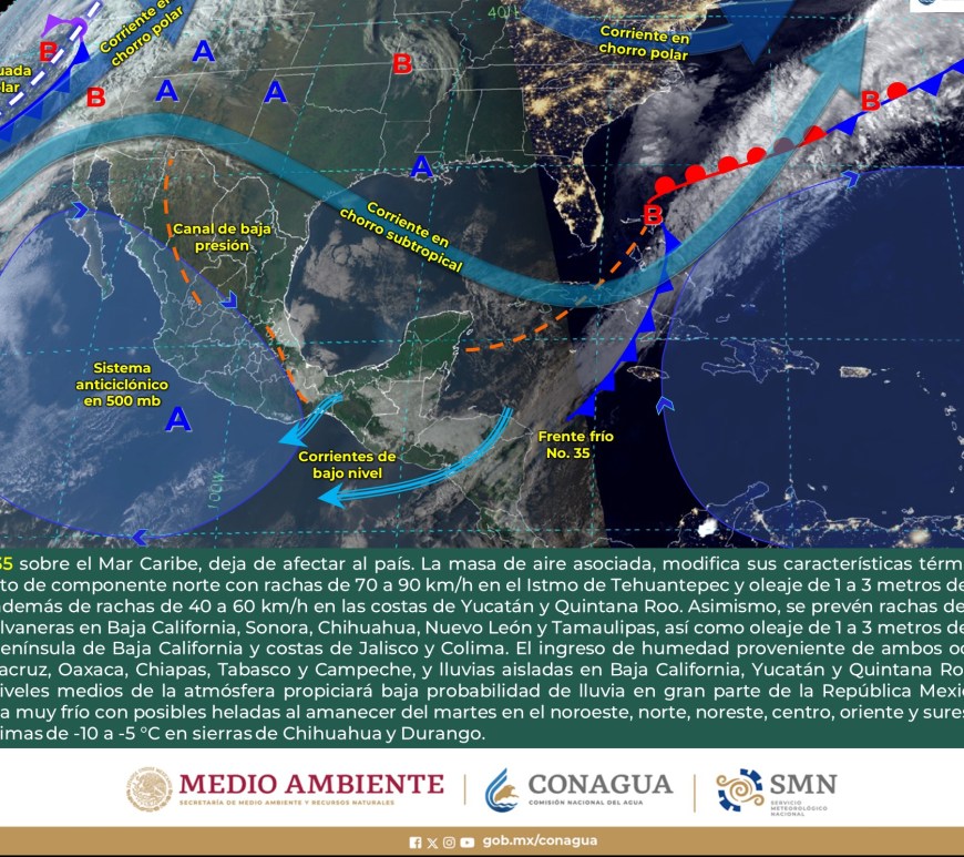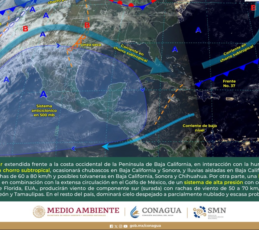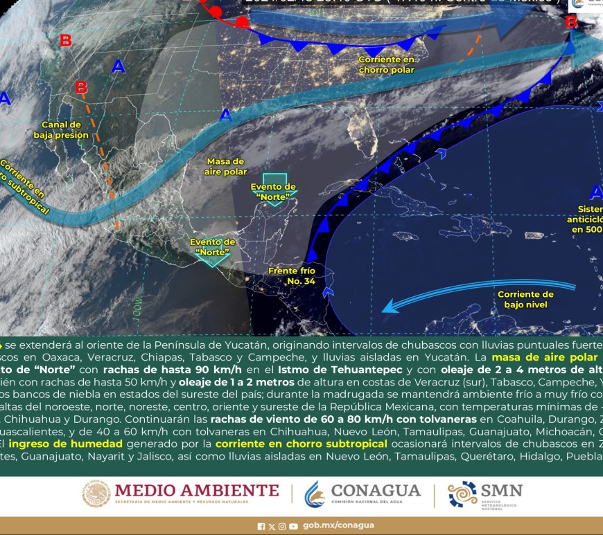SE PRONOSTICAN CHUBASCOS EN LA VERTIENTE DEL GOLFO DE MÉXICO Y LA PENÍNSULA DE YUCATÁN Cielo despejado a parcialmente nublado en la región, excepto Nuevo León y San Luis Potosí, donde dominará el cielo nublado con lluvias aisladas y chubascos respectivamente. Sin lluvia en Chihuahua, Coahuila, Durango, Zacatecas y Aguascalientes. Ambiente matutino fresco a frío y gélido en sierras de Chihuahua y Durango. Por la … Continúa leyendo Pronóstico Meteorológico 1 de Marzo