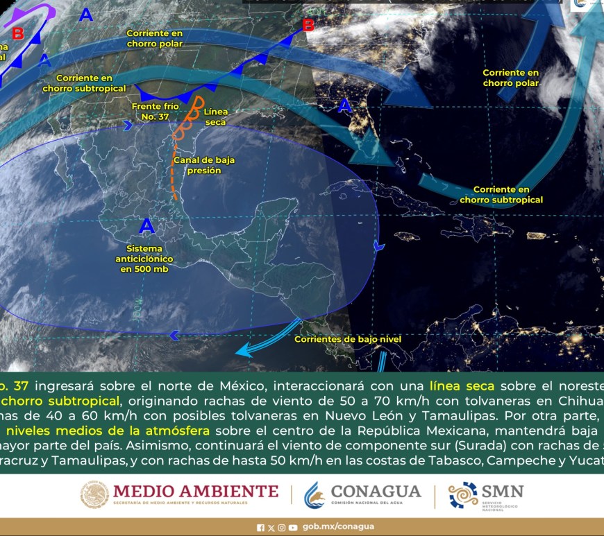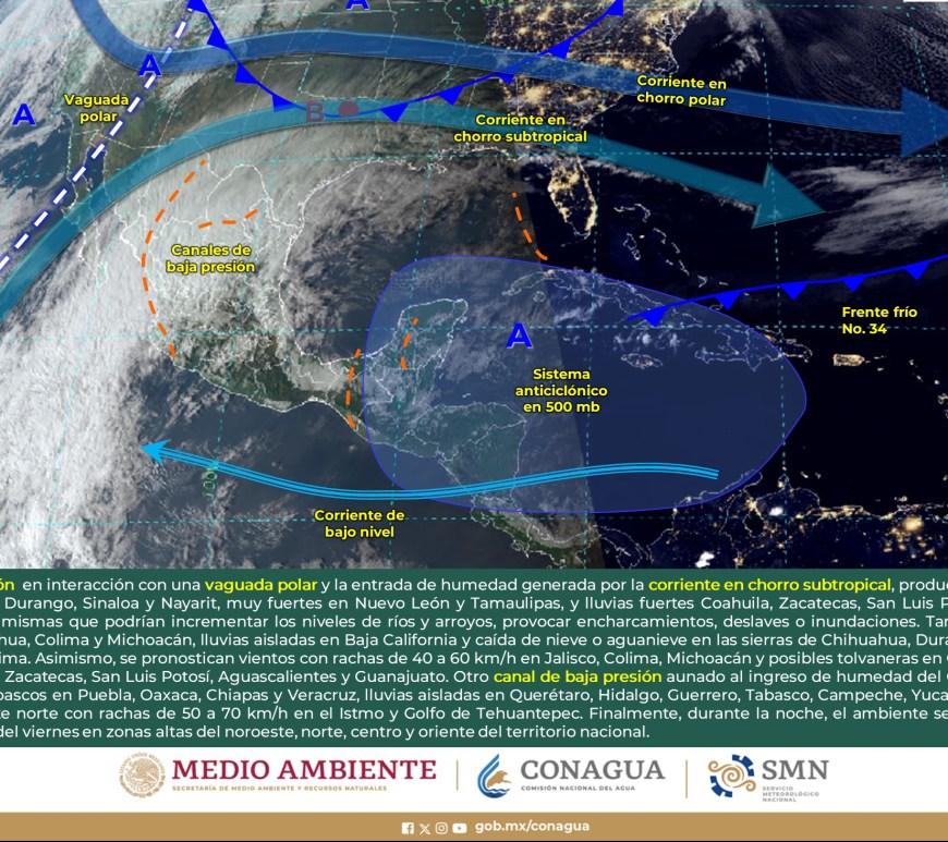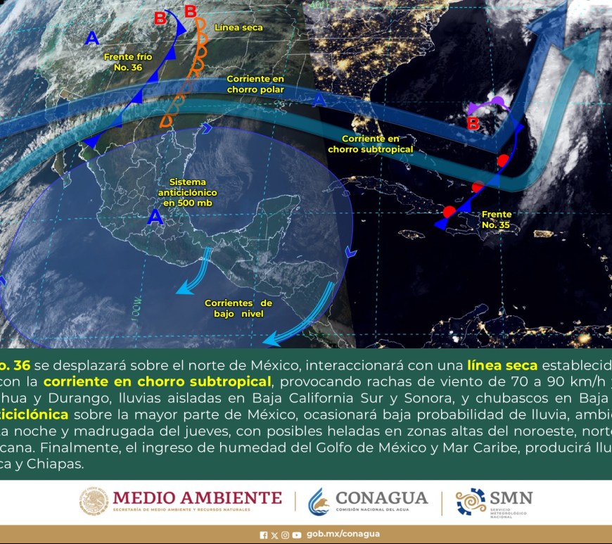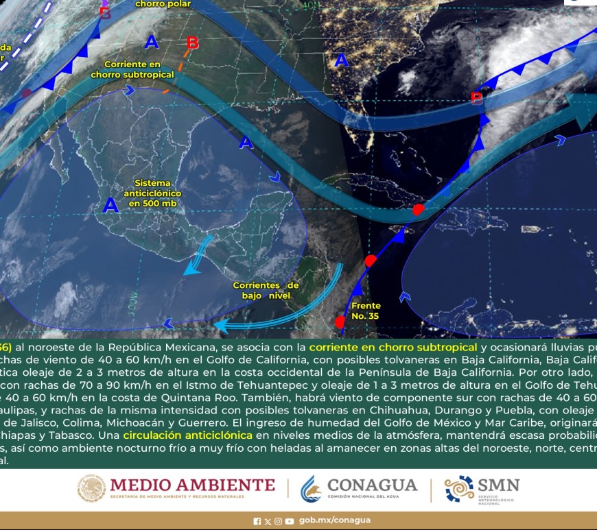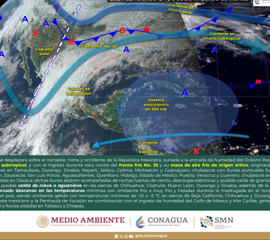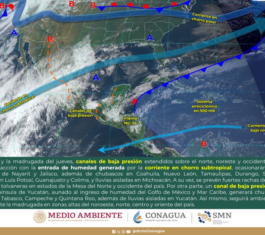 SE PRONOSTICAN CHUBASCOS EN LA VERTIENTE DEL GOLFO DE MÉXICO Y LA PENÍNSULA DE YUCATÁN Cielo despejado a parcialmente nublado en la región, excepto Nuevo León y San Luis Potosí, donde dominará el cielo nublado con lluvias aisladas y chubascos respectivamente. Sin lluvia en Chihuahua, Coahuila, Durango, Zacatecas y Aguascalientes. Ambiente matutino fresco a frío y gélido en sierras de Chihuahua y Durango. Por la … Continúa leyendo Pronóstico Meteorológico 1 de Marzo