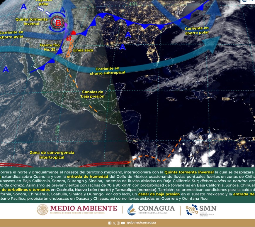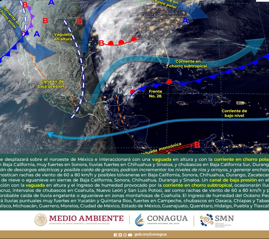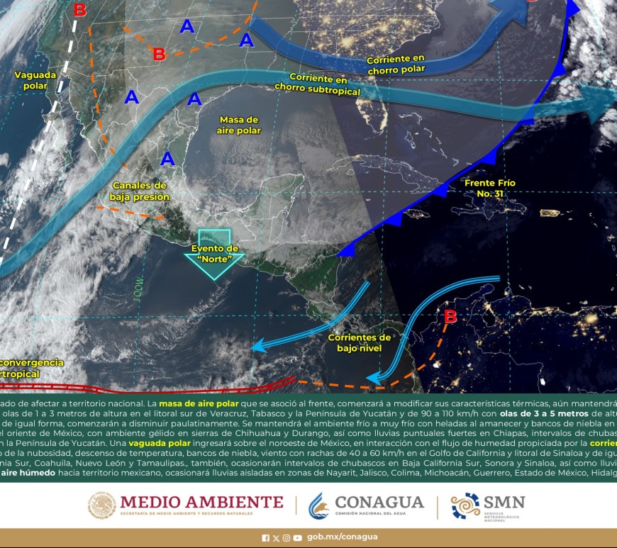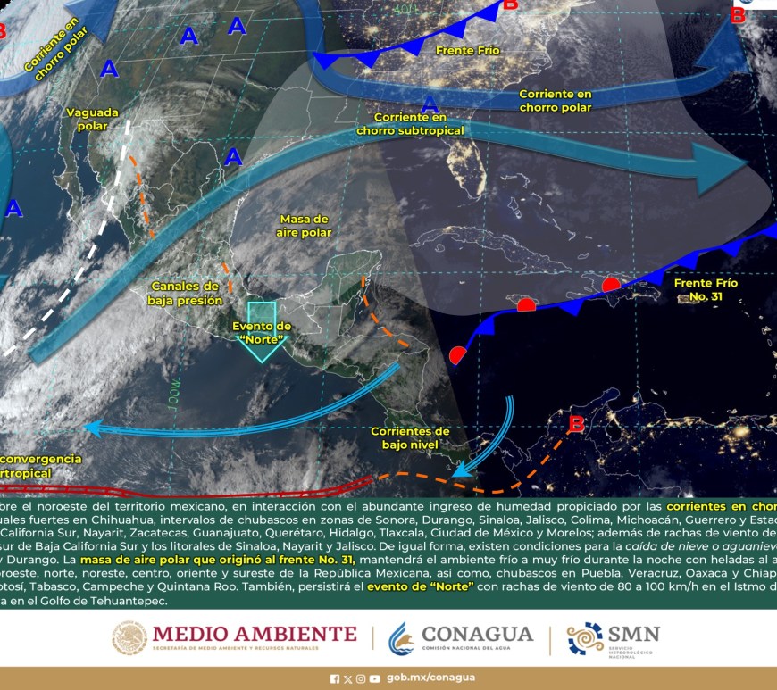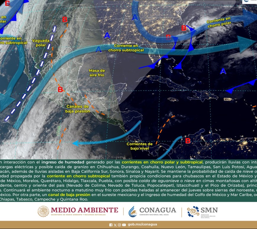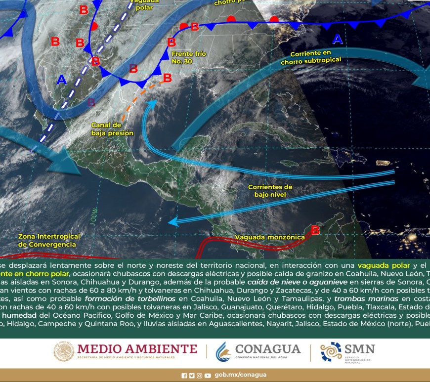 Cielo parcialmente nublado a medio nublado, con probabilidad de intervalos de chubascos en San Luis Potosí y lluvias aisladas en Chihuahua, Coahuila y Nuevo León, sin lluvia en el resto de la región. Ambiente matutino fresco a frío, y muy frío a gélido con heladas y bancos de niebla en zonas serranas de la región, así como posible caída de nieve o aguanieve en sierras de Chihuahua y lluvia engelante en zonas de … Continúa leyendo Pronóstico Meteorológico 11 de Febrero