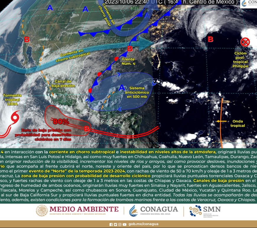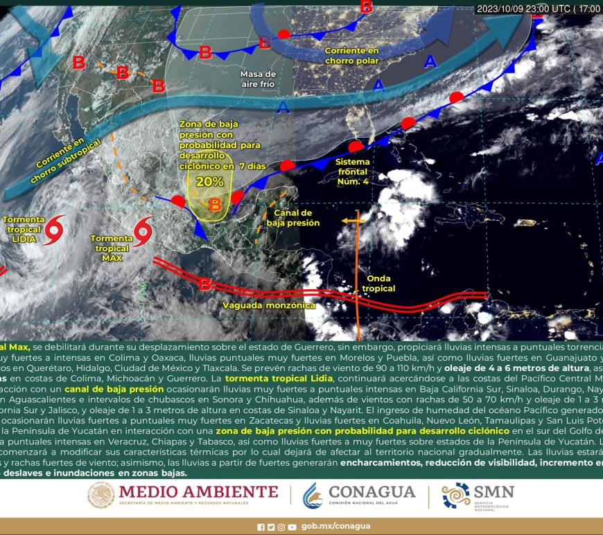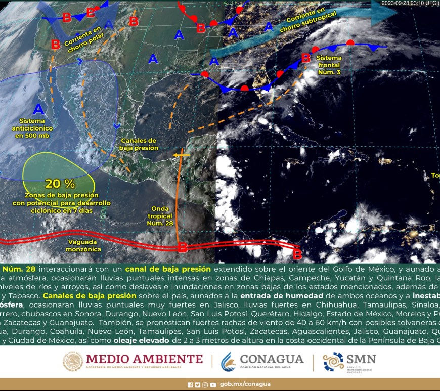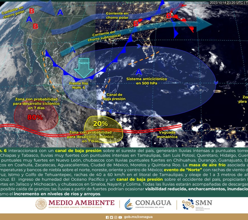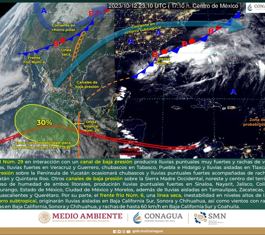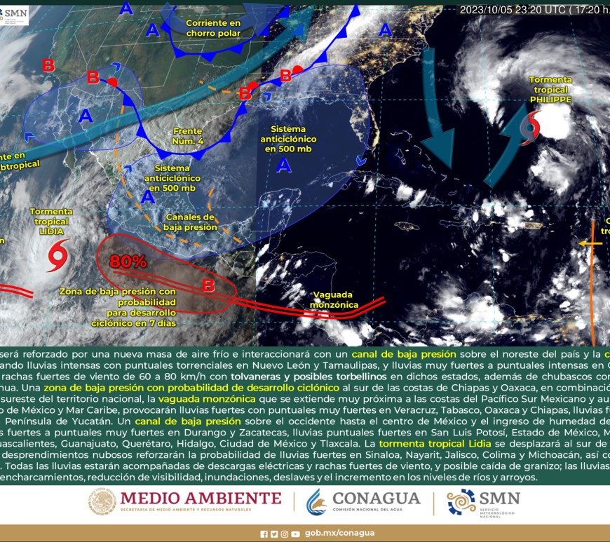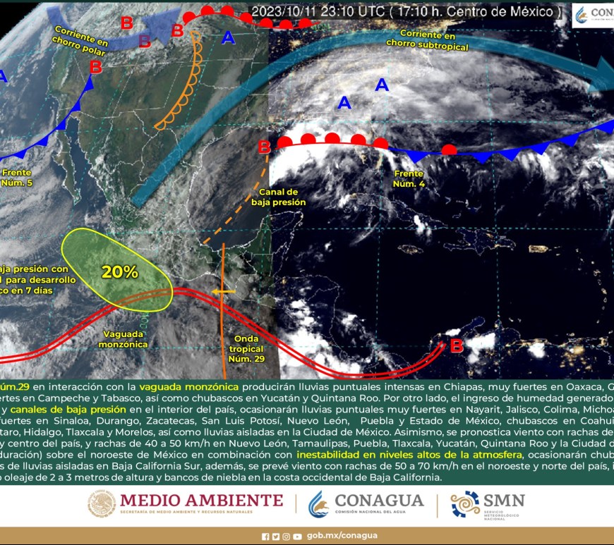 Pronóstico de lluvias 15 de octubre de 2023: Lluvias intensas con puntuales torrenciales (150 a 250 mm): Veracruz, Oaxaca, Chiapas, Tabasco y Campeche. Lluvias muy fuertes con puntuales intensas (75 a 150 mm): Puebla, Guerrero y Yucatán. Lluvias fuertes con puntuales muy fuertes (50 a 75 mm): Quintana Roo. Intervalos de chubascos con lluvias puntuales fuertes (25 a 50 mm): Nayarit, Jalisco, Colima, Michoacán, Estado … Continúa leyendo Pronóstico Meteorológico 15 de Octubre