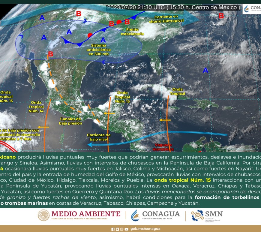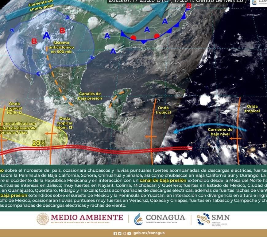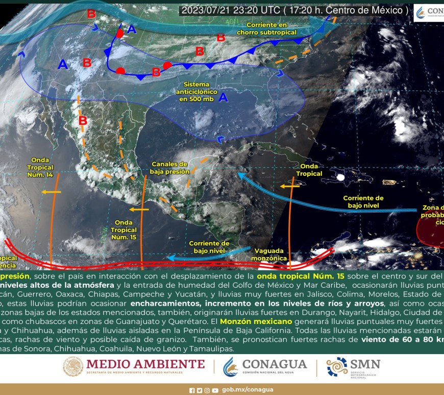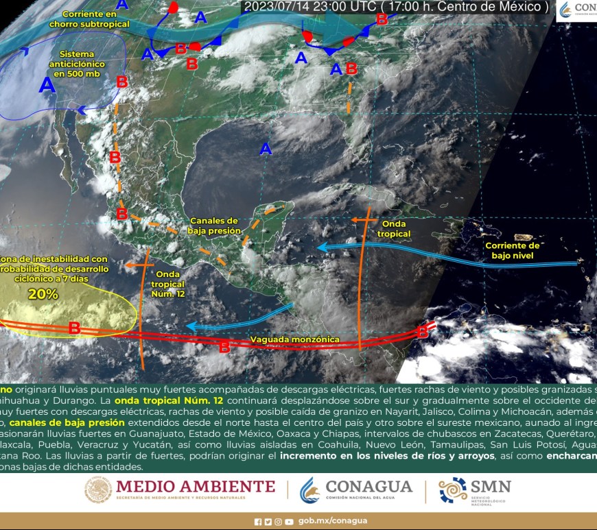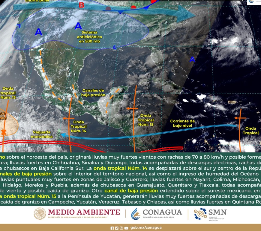 Cielo parcialmente nublado por la mañana y nublado en el transcurso de la tarde, con lluvias puntuales fuertes en Durango, Zacatecas, Aguascalientes, chubascos en Chihuahua, Coahuila, San Luis Potosí y Nuevo León, acompañadas de descargas eléctricas y posible caída de granizo, las cuales podrían incrementar los niveles de ríos y arroyos, y generar deslaves e inundaciones. Ambiente fresco por la mañana y caluroso a muy caluroso durante la … Continúa leyendo Pronóstico Meteorológico 26 de Julio