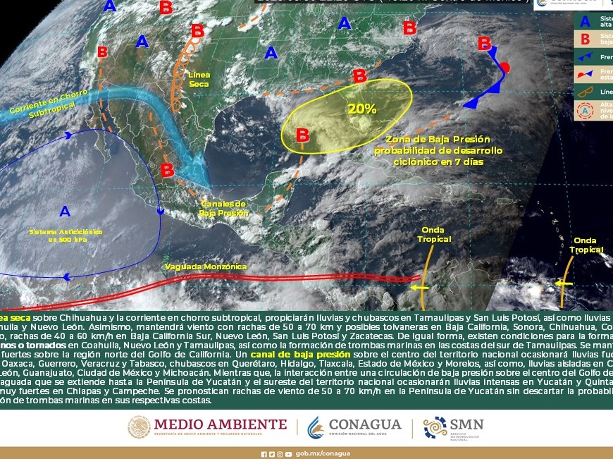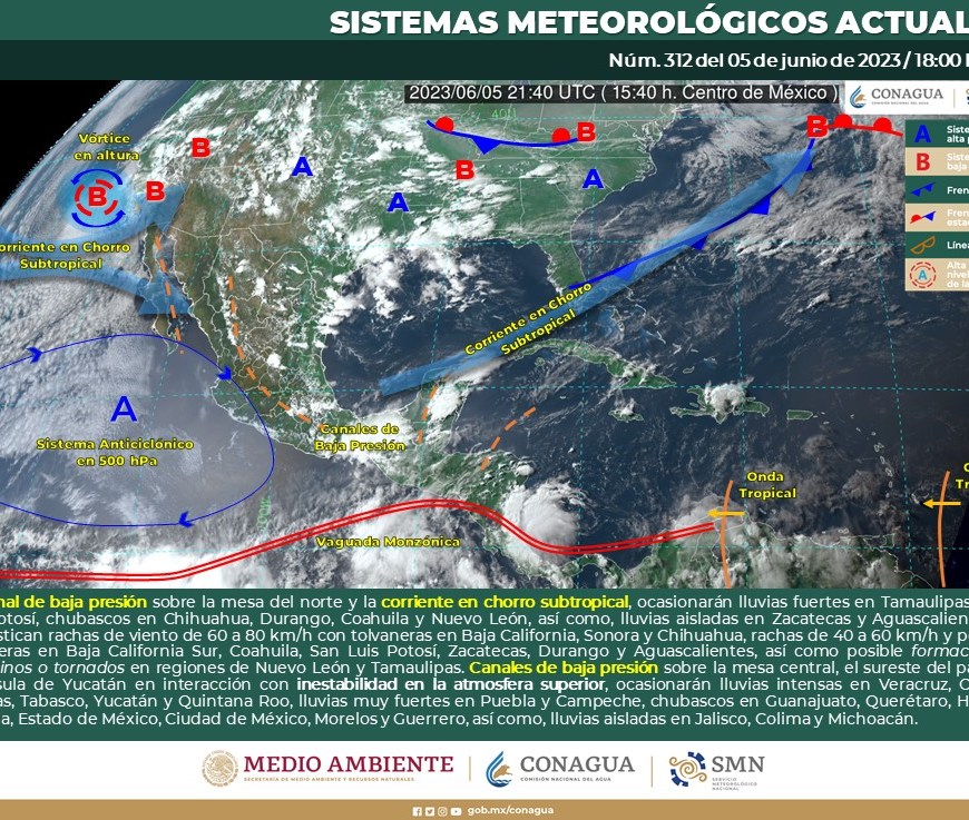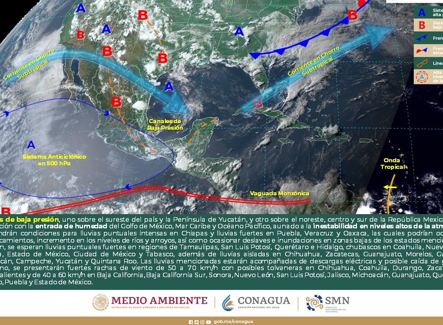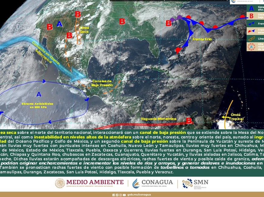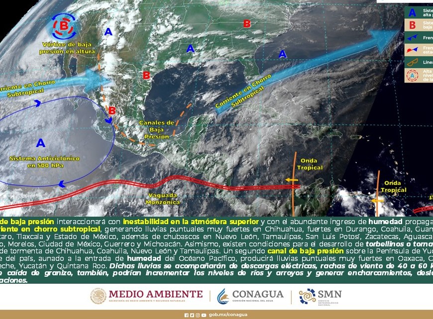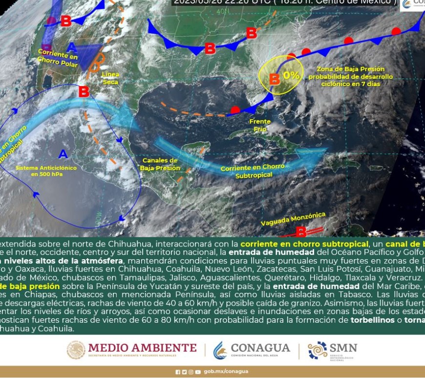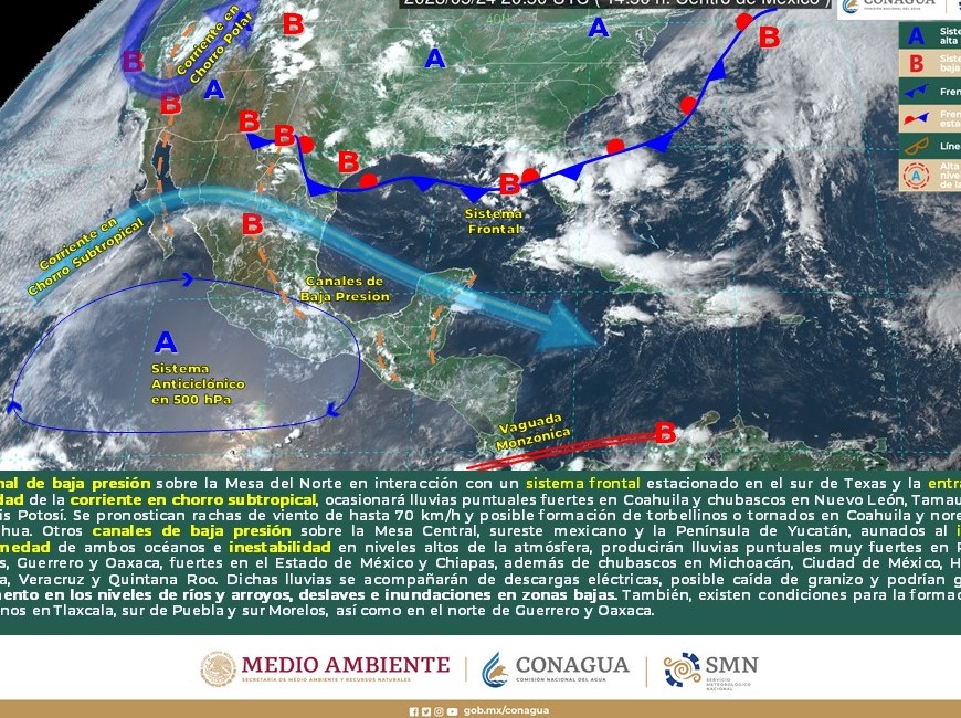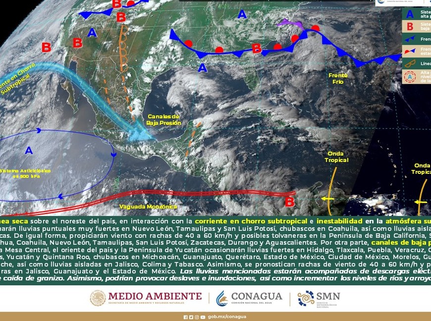Cielo medio nublado a nublado durante el día, con bancos de niebla en zonas serranas de Coahuila, Nuevo León y San Luis Potosí. Ambiente cálido a caluroso durante la tarde. Lluvias puntuales fuertes en Coahuila y Nuevo León, así como chubascos en San Luis Potosí, las cuales podrían incrementar los niveles de ríos y arroyos, y generar deslaves e inundaciones; todas las lluvias con descargas eléctricas y … Continúa leyendo Pronóstico Meteorológico