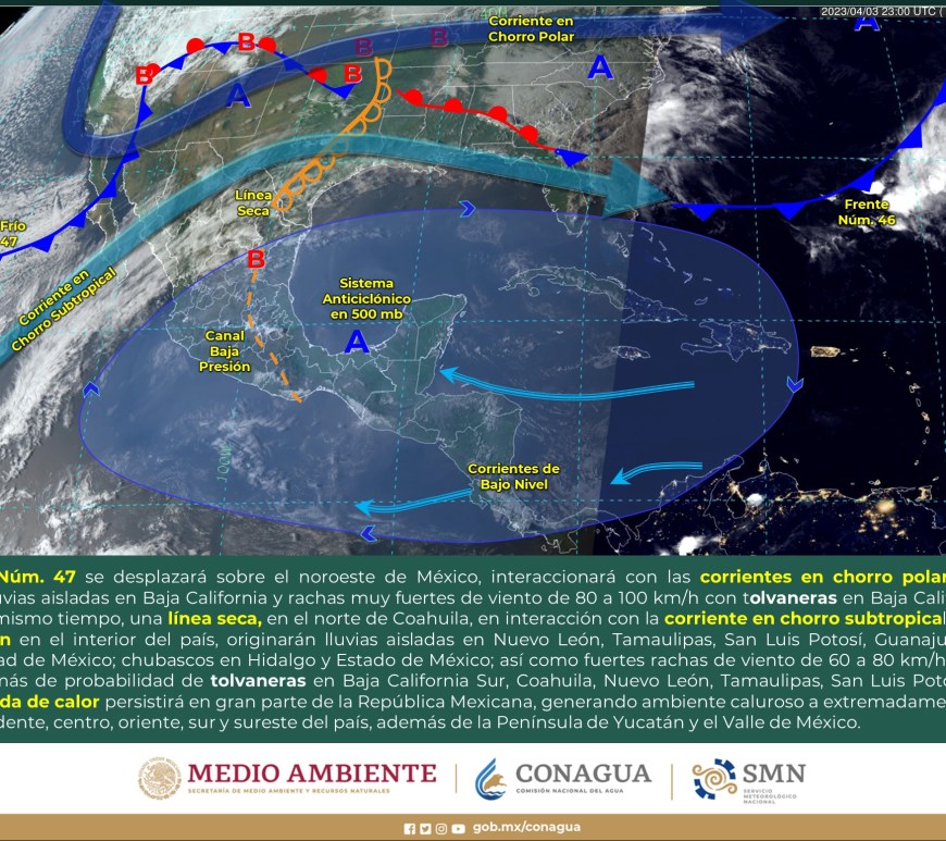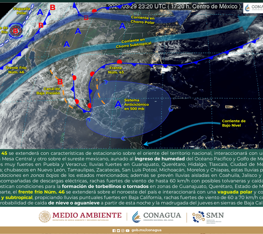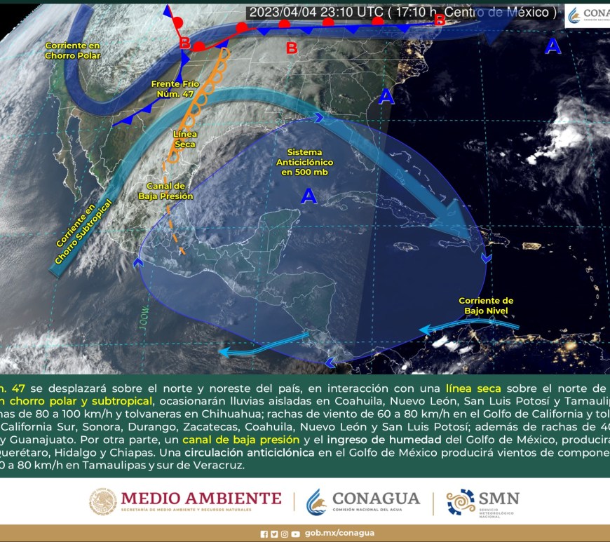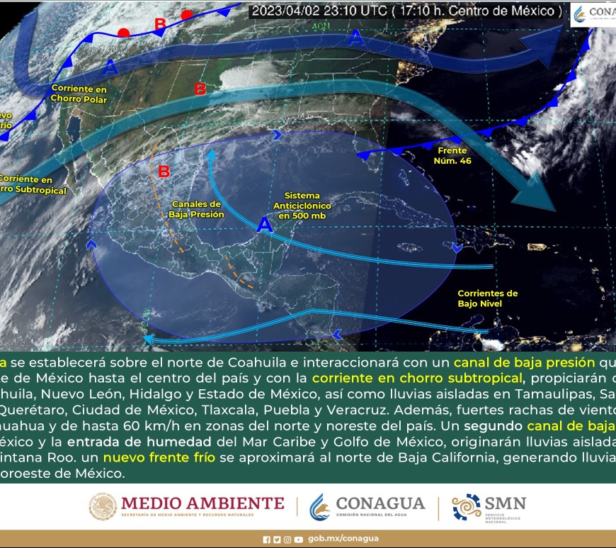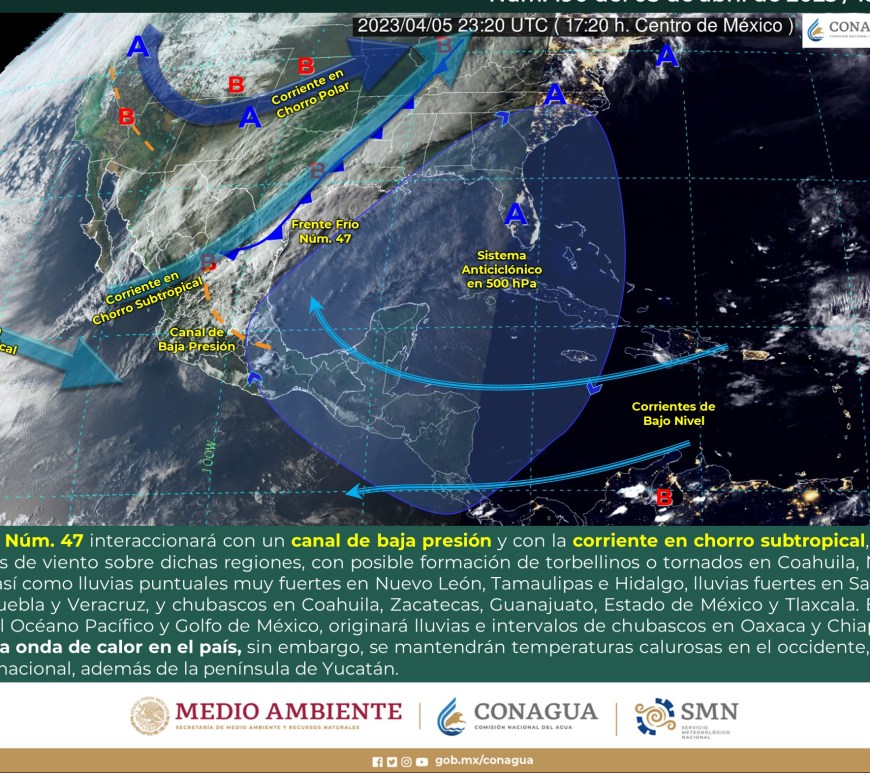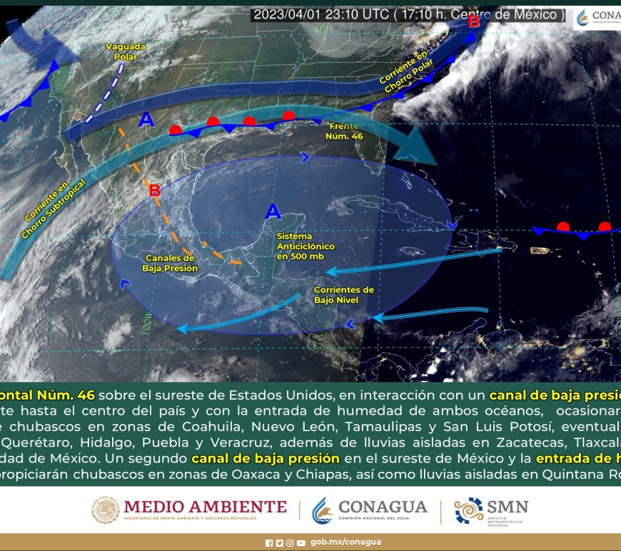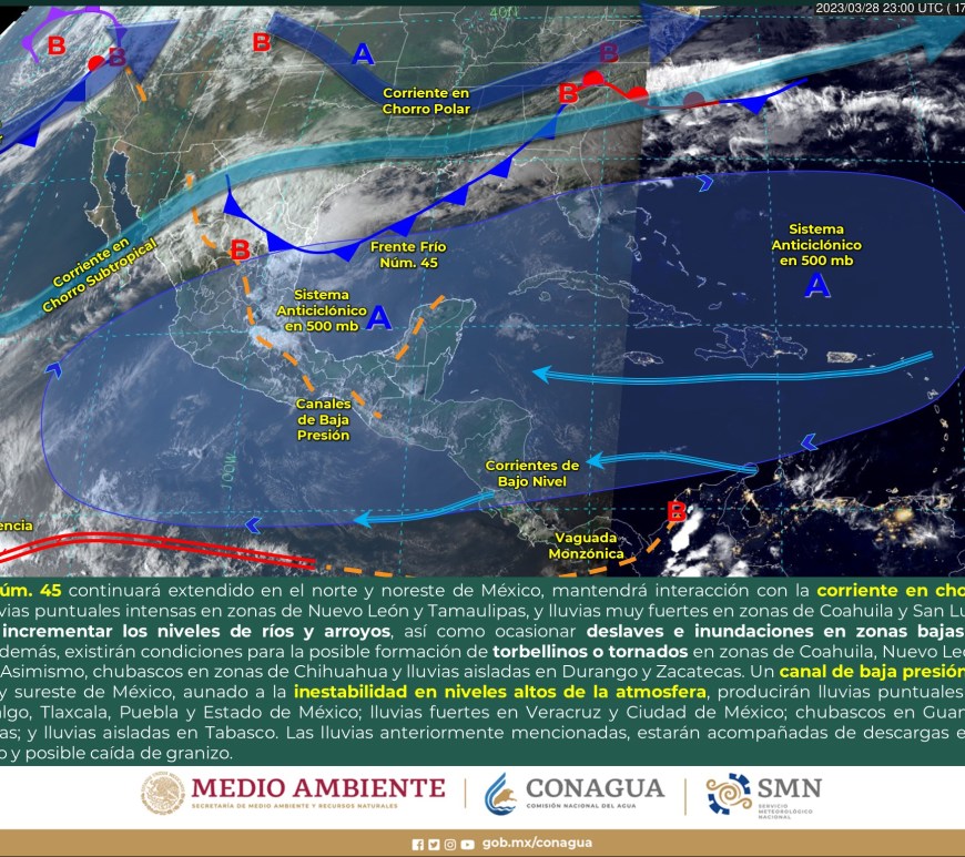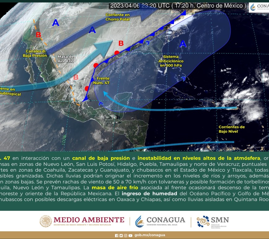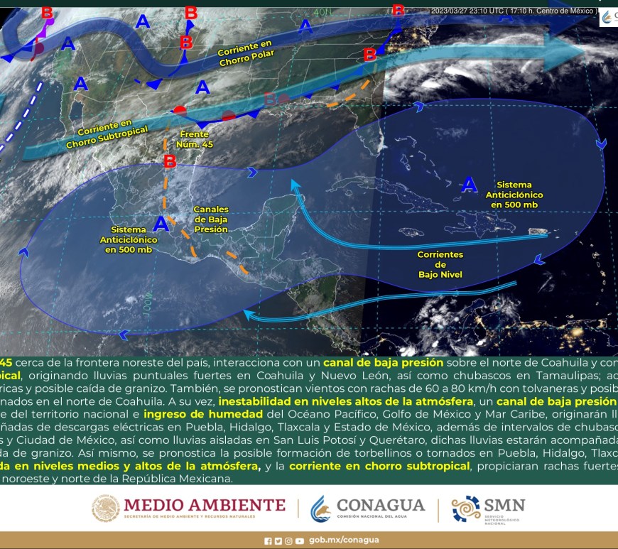 Cielo medio nublado a nublado. Ambiente fresco por la mañana, siendo frío a muy frío con heladas en sierras de Chihuahua y Durango. Por la tarde, ambiente templado a cálido en la región. Lluvias y chubascos en San Luis Potosí y con posibles granizadas en Nuevo León, además de lluvias aisladas en Chihuahua, Coahuila, Durango y Zacatecas, las cuales podrían acompañarse de descargas eléctricas, y sin … Continúa leyendo Pronóstico Meteorológico