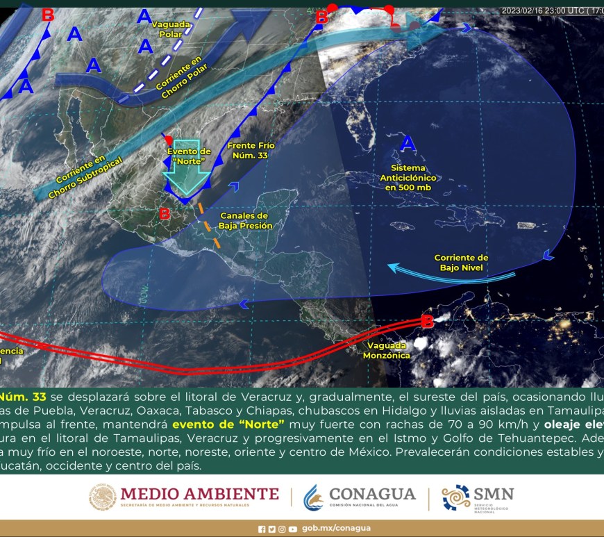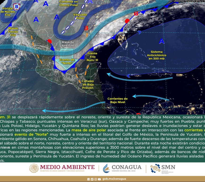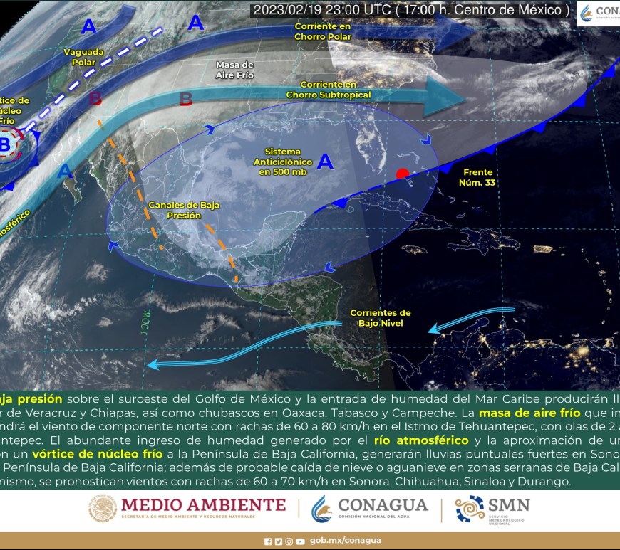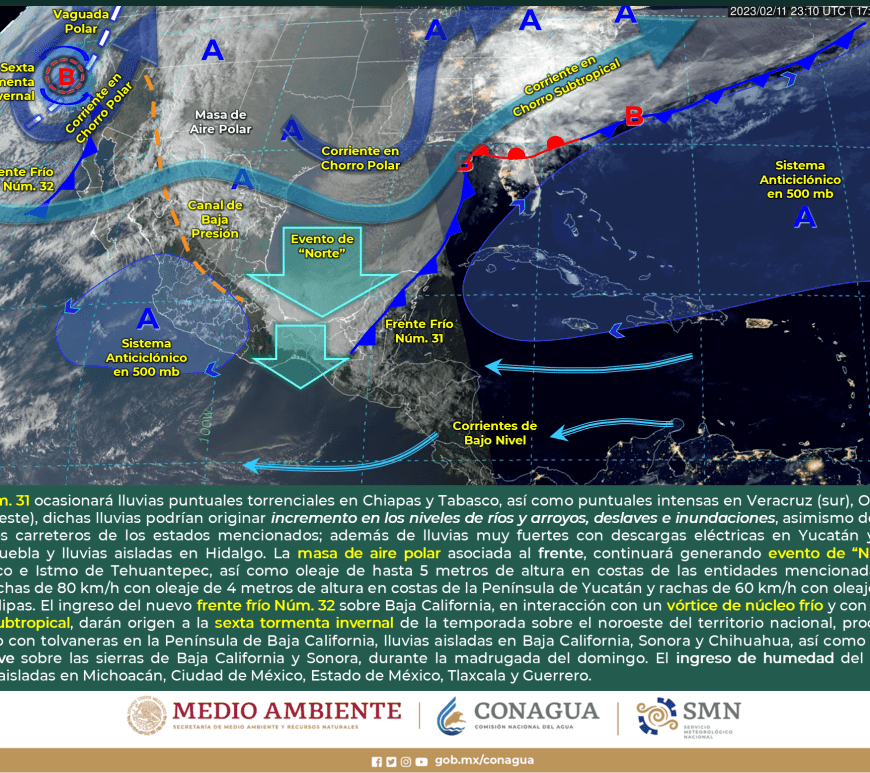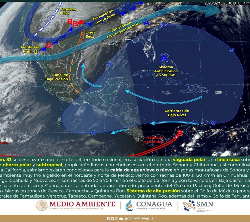 Ingreso de humedad generado por el río atmosférico y la aproximación de un nuevo frente frío (frente frío Núm. 34) asociado con un vórtice de núcleo frío a la Península de Baja California, generarán lluvias puntuales fuertes en Sonora y Chihuahua, chubascos en la Península de Baja California y probable caída de nieve o aguanieve en zonas serranas de Baja California, Sonora y Chihuahua. Asimismo, se pronostican vientos con rachas de 60 a 70 km/h … Continúa leyendo Aviso Nuevo Frente Frio 34