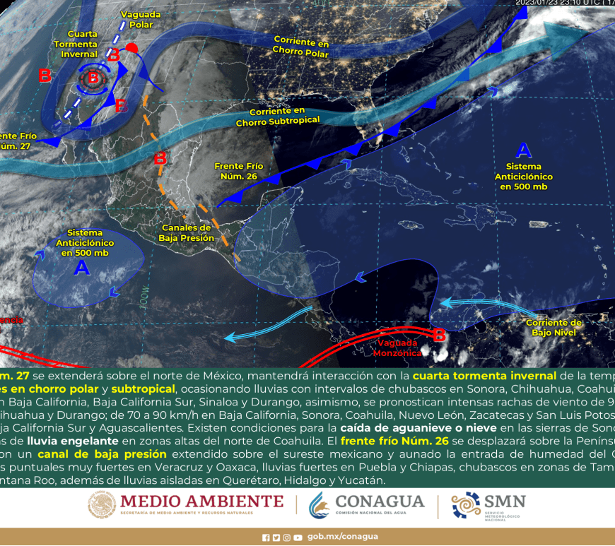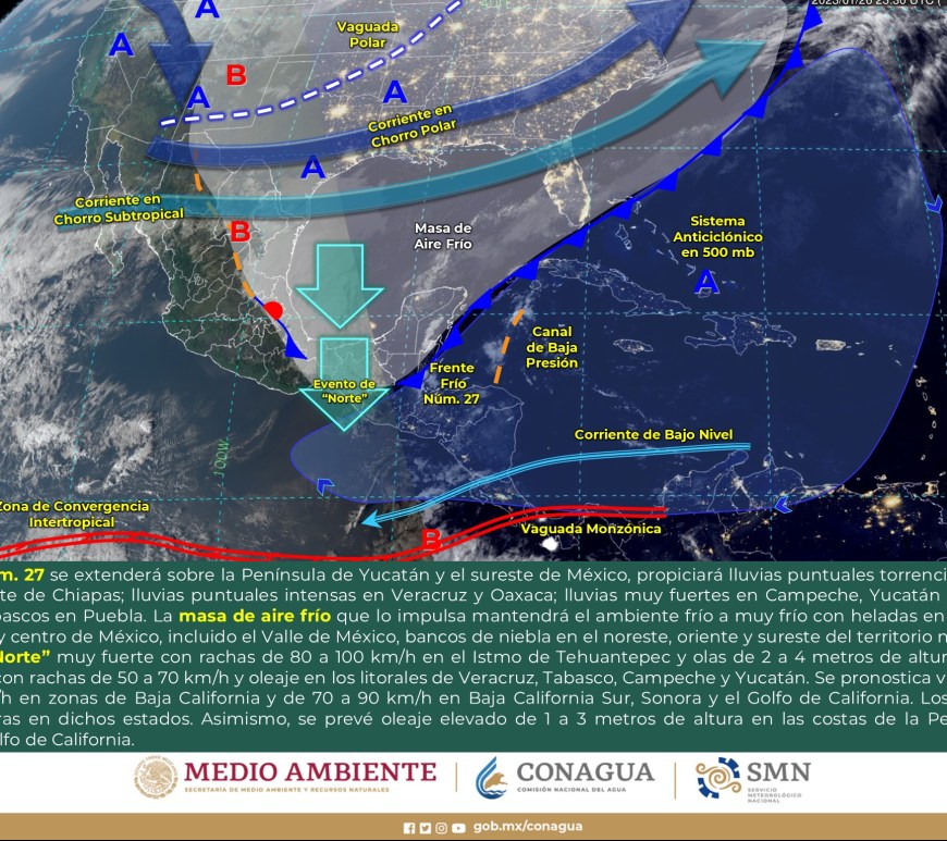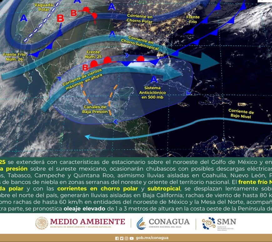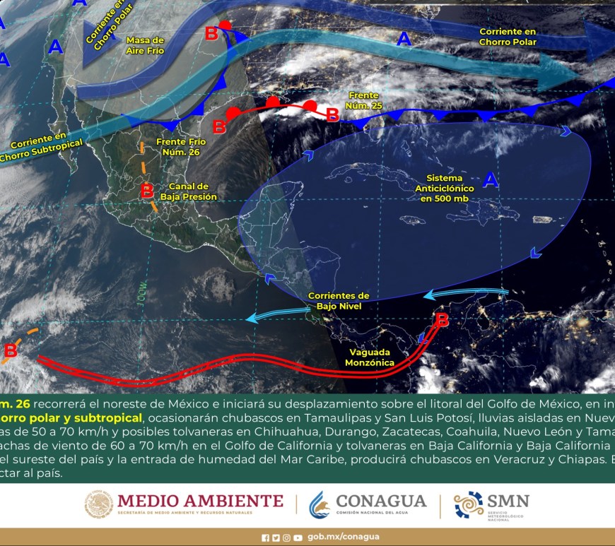 Cielo nublado con lluvias puntuales muy fuertes en zonas de Chihuahua y Durango, cielo medio nublado con lluvias fuertes en Coahuila, chubascos en Nuevo León y lluvias aisladas en Zacatecas y San Luis Potosí. Ambiente muy frío al amanecer, siendo gélido en sierras de Chihuahua y Durango. Ambiente templado y cálido por la tarde. Dominará viento de componente oeste de 15 a 30 km/h con … Continúa leyendo Pronóstico Meteorológico 31 de Enero