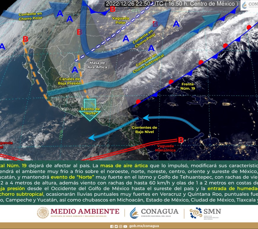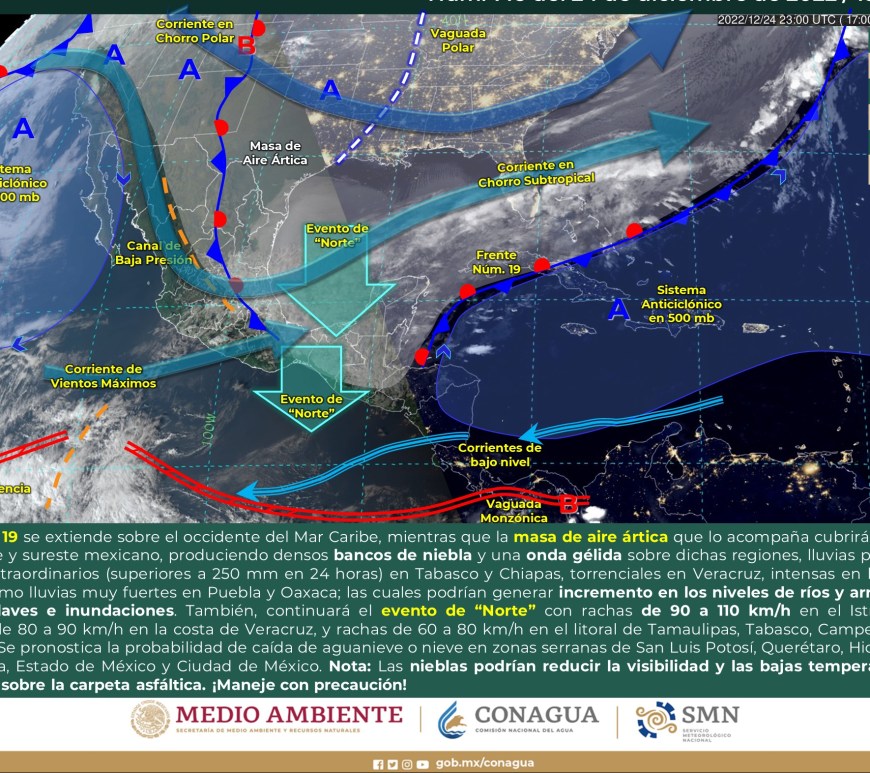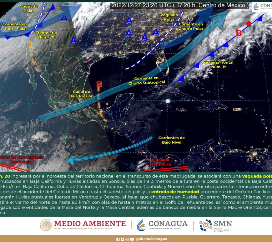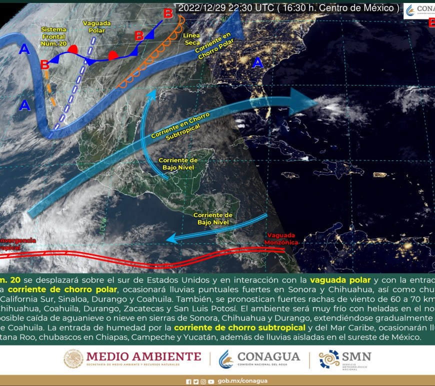 Frente frío Núm. 21 se aproximará e ingresará al norte de Baja California. El sistema interaccionará con una vaguada polar y la corriente en chorro polar, ocasionando lluvias puntuales fuertes y vientos con rachas fuertes en dicho estado, además originará lluvias con intervalos de chubascos, posibles tolvaneras y ambiente frío en el noroeste de México. Existen condiciones para la caída de aguanieve o nieve en la sierra de Baja … Continúa leyendo Aviso Frente Frio 21