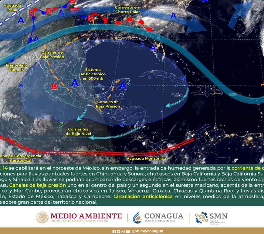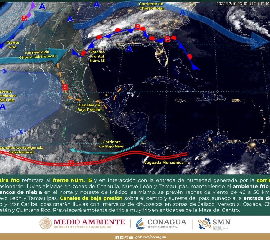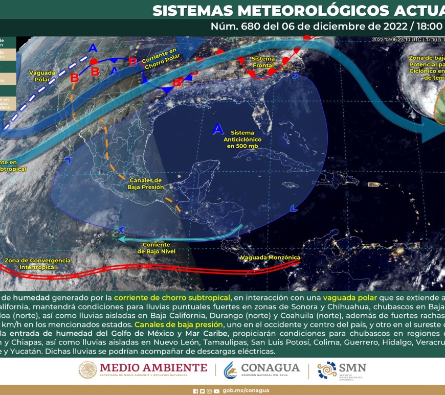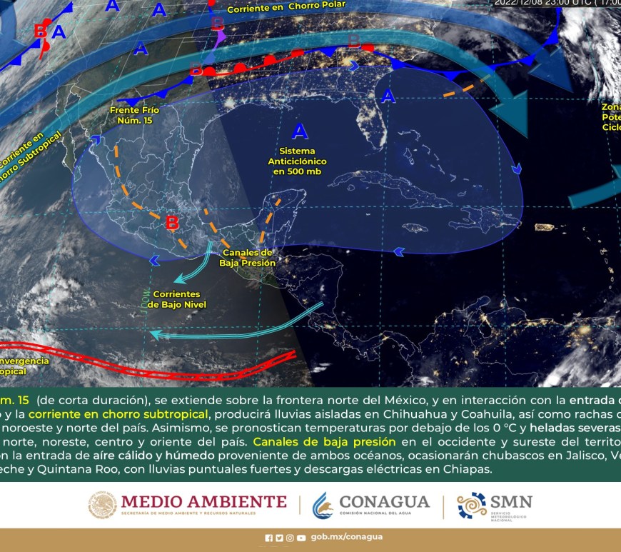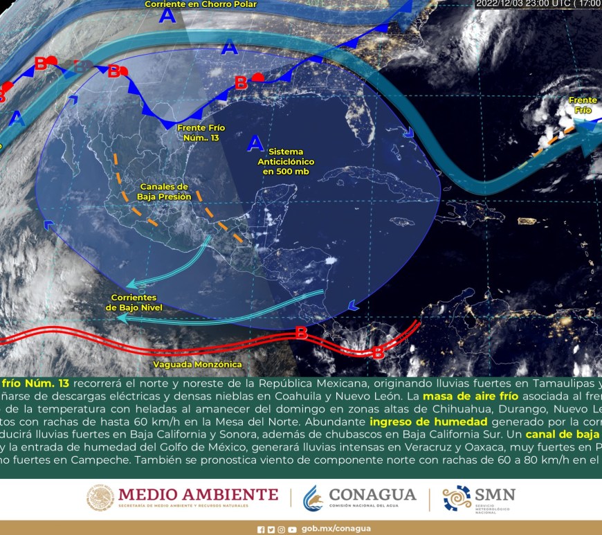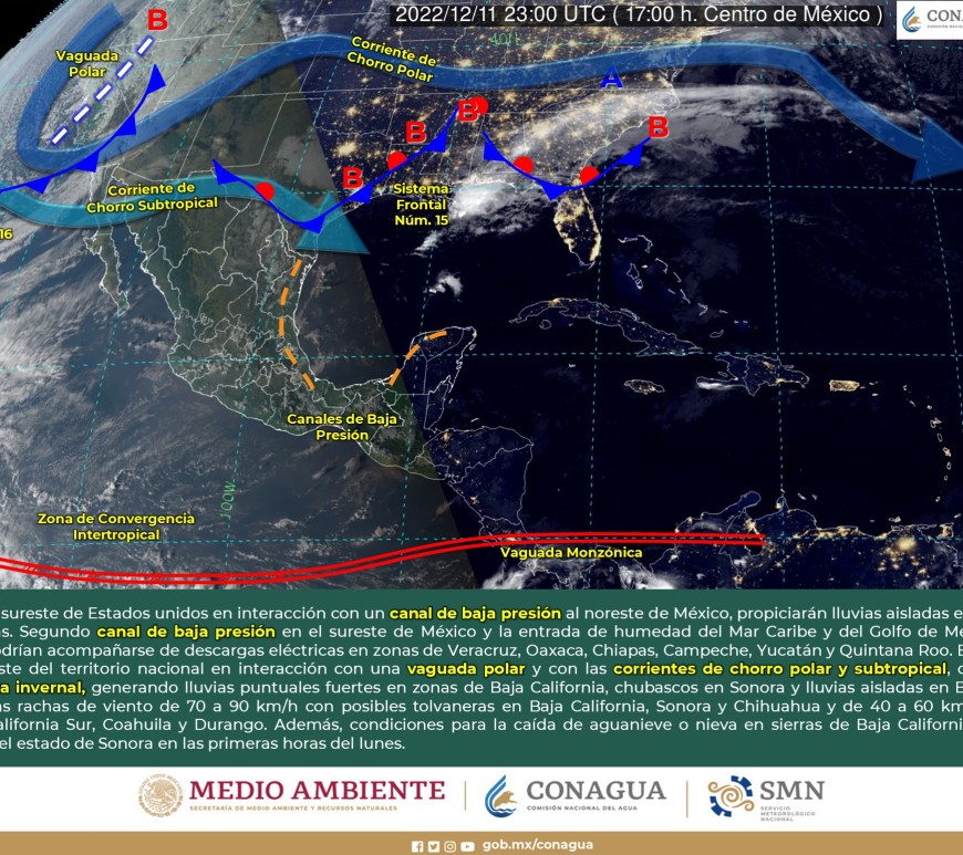 El frente frío Núm. 16 se extenderá sobre el noroeste del territorio nacional y en interacción con una vaguada polar y con las corrientes de chorro polar y subtropical, darán origen a la segunda tormenta invernal, generando lluvias puntuales fuertes en zonas de Baja California, chubascos en Sonora y lluvias aisladas en Baja California Sur, asimismo, intensas rachas de viento de 70 a 90 km/h … Continúa leyendo Aviso de Frente Frió 16 y Segunda Tormenta Invernal