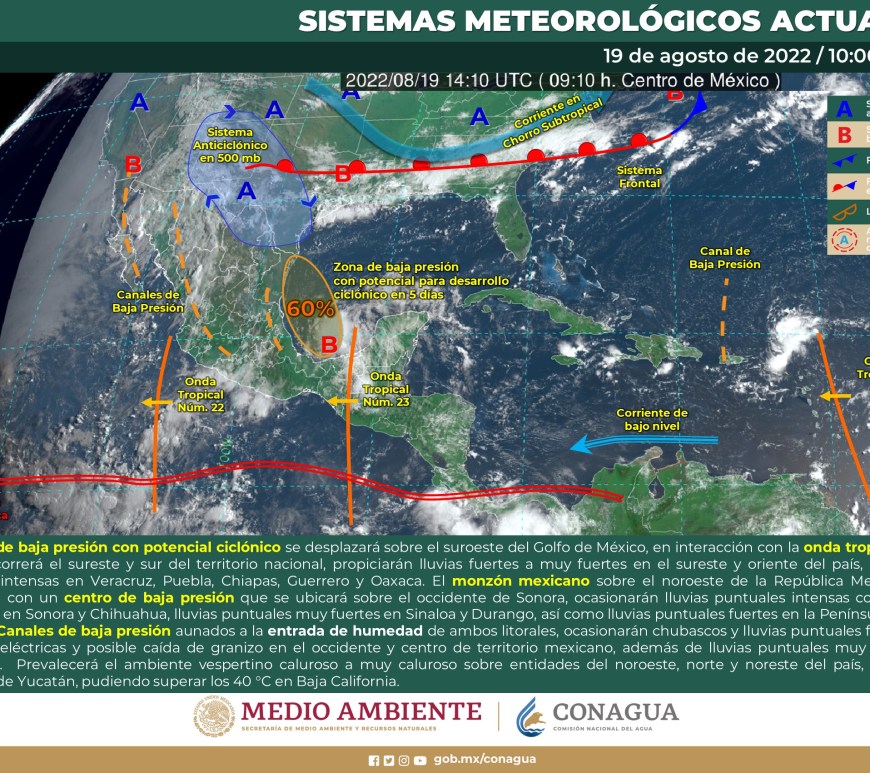Pronóstico de lluvias 07 de septiembre de 2022: Lluvias intensas con puntuales torrenciales (150 a 250 mm): Baja California Sur.Lluvias fuertes con puntuales muy fuertes (50 a 75 mm): Sinaloa (costa), Zacatecas, Aguascalientes, Guanajuato, Querétaro, San Luis Potosí, Tamaulipas, Veracruz, Puebla, Oaxaca y Chiapas.Intervalos de chubascos con lluvias puntuales fuertes (25 a 50 mm): Baja California, Sonora, Durango, Nuevo León, Nayarit, Jalisco, Michoacán, Guerrero, Morelos, … Continúa leyendo Pronóstico Meteorológico