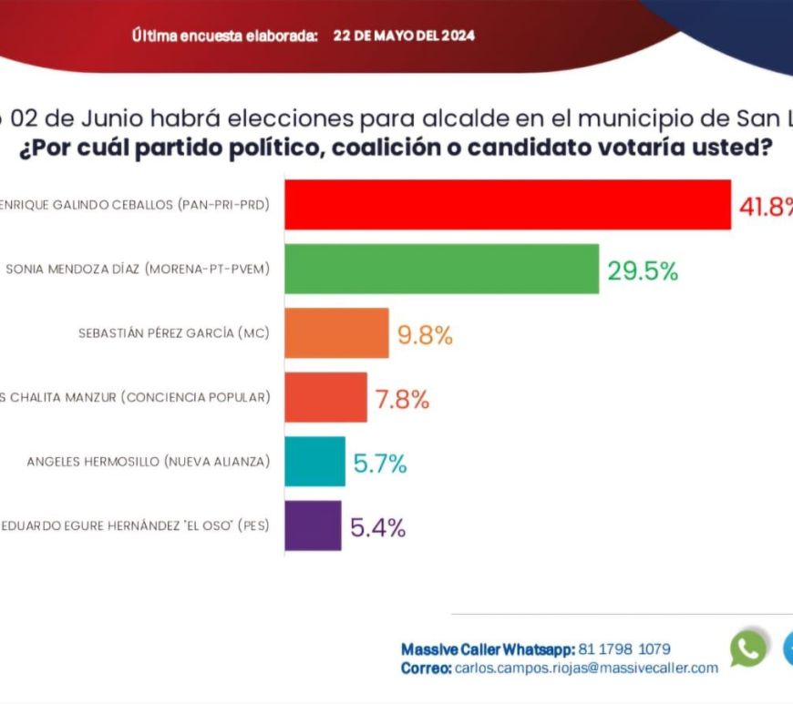 Esa casa encuestadora le da una diferencia de 12.3 por ciento a favor del candidato de la alianza Fuerza y Corazon por San Luis, que concuerda con el 13.8 por ciento que le otorga la empresa Rubrum. Enrique Galindo Ceballos ha incrementado su ventaja en las preferencias electorales rumbo a la elección a presidente municipal del próximo 2 de junio, de acuerdo con la última … Continúa leyendo Encuesta de Massive Caller confirma amplia ventaja de Enrique Galindo