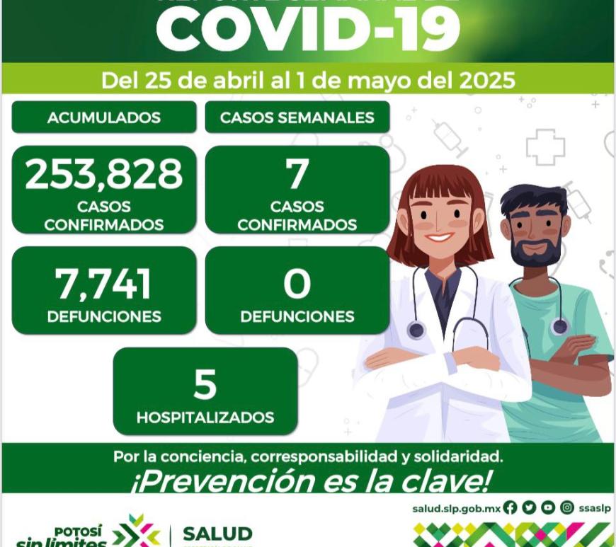 A la baja circulación del virus por Covid-19 en la entidad. Para prevenir contagios, se recomienda adoptar medidas de higiene como el lavado de manos, cubrirse al toser o estornudar, y usar cubrebocas si presenta síntomas de infección respiratoria.Del 9 al 15 de mayo del presente año, se registró 1 nuevo contagio de COVID-19 confirmando el Comité Estatal para la Seguridad en Salud y los … Continúa leyendo San Luis Potosí acumula un nuevo caso por COVID- 19 en la última semana