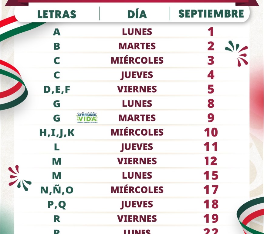 Del 1° al 25 de septiembre se realiza la dispersión bancaria, de acuerdo a la letra del primer apellido Consulta el calendario de pago en la página oficial de la Secretaría de Bienestar: gob.mx/bienestar La secretaria de Bienestar, Ariadna Montiel Reyes, informó que, del 1 al 25 de septiembre, los derechohabientes y beneficiarios de las Pensiones y Programas para el Bienestar de las mujeres, adultos mayores, … Continúa leyendo Este 1° de septiembre inicia el pago de las Pensiones y Programas del Bienestar del bimestre septiembre-octubre: Ariadna Montiel Reyes