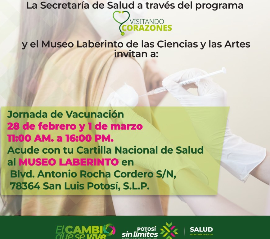Sábado 28 de febrero y domingo 1 de marzo, Jornada de Vacunación en el Museo Laberinto de las Ciencias y las Artes. Acude de 11:00 a 16:00 horas con tu Cartilla Nacional de Salud. Se iniciarán o completarán esquemas básicos de vacunación, con énfasis en sarampión. La Secretaría de Salud a través del Programa Visitando Corazones y en coordinación con el Museo Laberinto de las … Continúa leyendo Jornada de vacunación en el Museo Laberinto de las Ciencias y las Artes