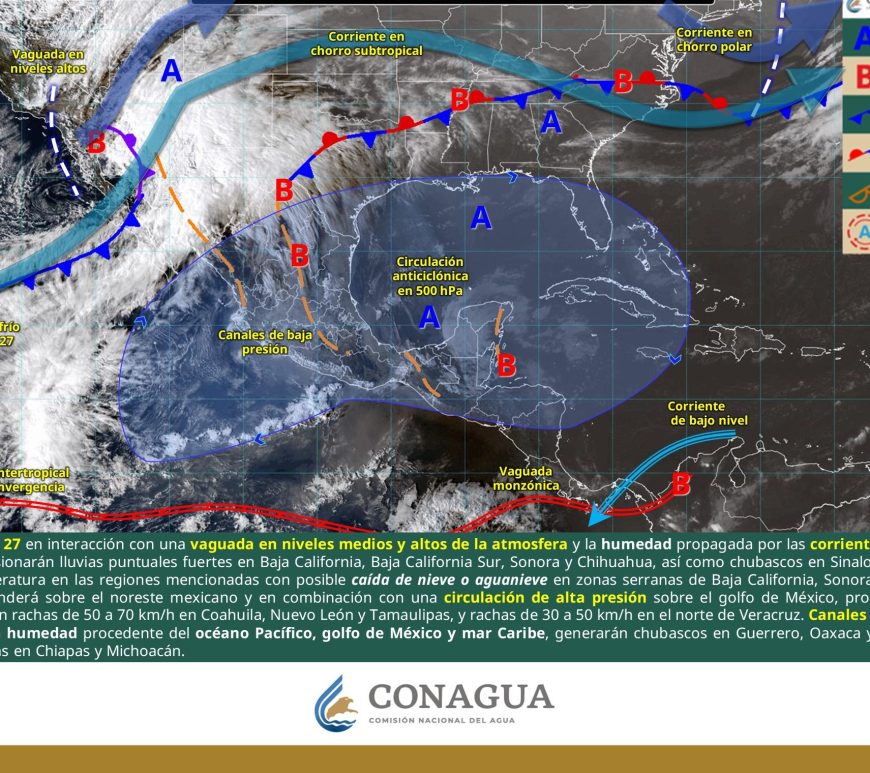 Cielo medio nublado a nublado en el transcurso del día, con probabilidad de chubascos en Chihuahua. Cielo parcialmente nublado y sin lluvia en el resto de la región. Por la mañana, ambiente fresco y frío a muy frío con heladas en zonas montañosas, así como gélido en zonas serranas de Durango y Chihuahua. Posible caída de nieve o aguanieve en el norte de Chihuahua. Durante la … Continúa leyendo Pronóstico Meteorológico