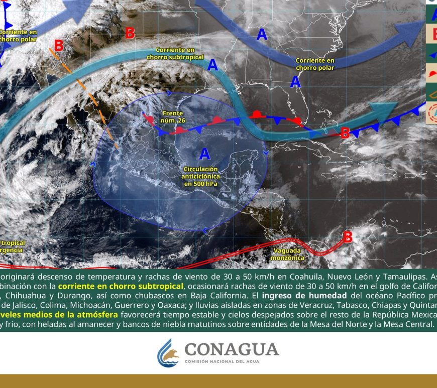 Cielo despejado a medio nublado en el transcurso del día, sin lluvia en la región. Por la mañana, ambiente frío en zonas serranas de Coahuila y Aguascalientes; muy frío con heladas en zonas serranas de San Luis Potosí, Nuevo León y Zacatecas; así como gélido con heladas en zonas serranas de Durango y Chihuahua. Durante la tarde, ambiente cálido en Coahuila, Nuevo León y San … Continúa leyendo Pronóstico Meteorológico