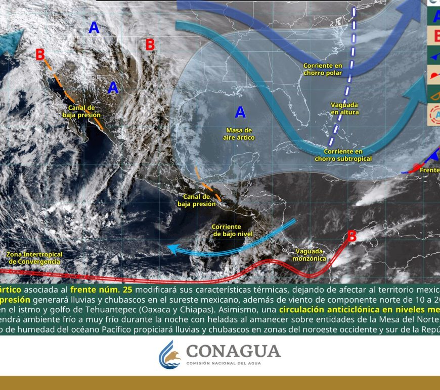 Cielo despejado a medio nublado en el transcurso del día, sin lluvia en la región. Por la mañana, ambiente frío en zonas serranas de Coahuila y Aguascalientes; muy frío con heladas en zonas serranas de Nuevo León, San Luis Potosí y Zacatecas; así como gélido con heladas en zonas serranas de Durango y Chihuahua. Durante la tarde, ambiente fresco a templado en la región; y … Continúa leyendo Pronóstico Meteorológico