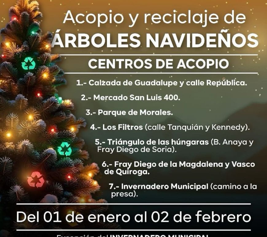 Son recibidos en 7 puntos diferentes de la ciudad, para ser convertidos en composta y beneficiar unas 35 mil plantas. Continúa abierta la invitación del Gobierno Municipal para que las personas que adquirieron pinos naturales para la temporada navideña, los depositen en alguno de los siete centros de acopio ubicados en diferentes zonas de la ciudad, donde se les dará el tratamiento adecuado para ser … Continúa leyendo Continúa la invitación del Gobierno Municipal para llevar árboles navideños a los centros de acopio