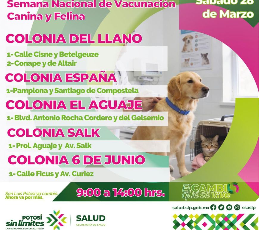 · Si tu perro o gato ya cumplió el mes de edad, llévalo a vacunar. · Este fin de semana vacuna a tu perro o gato · Brigadas de vacunación antirrábica se ubicaran en diversos puntos de la ciudad el sábado 28 y domingo 29 de marzo. Para prevenir enfermedades zoonóticas en la población potosina y siguiendo las indicaciones del Gobernador Ricardo Gallardo Cardona, los … Continúa leyendo Vacuna a tus mascotas contra la rabia