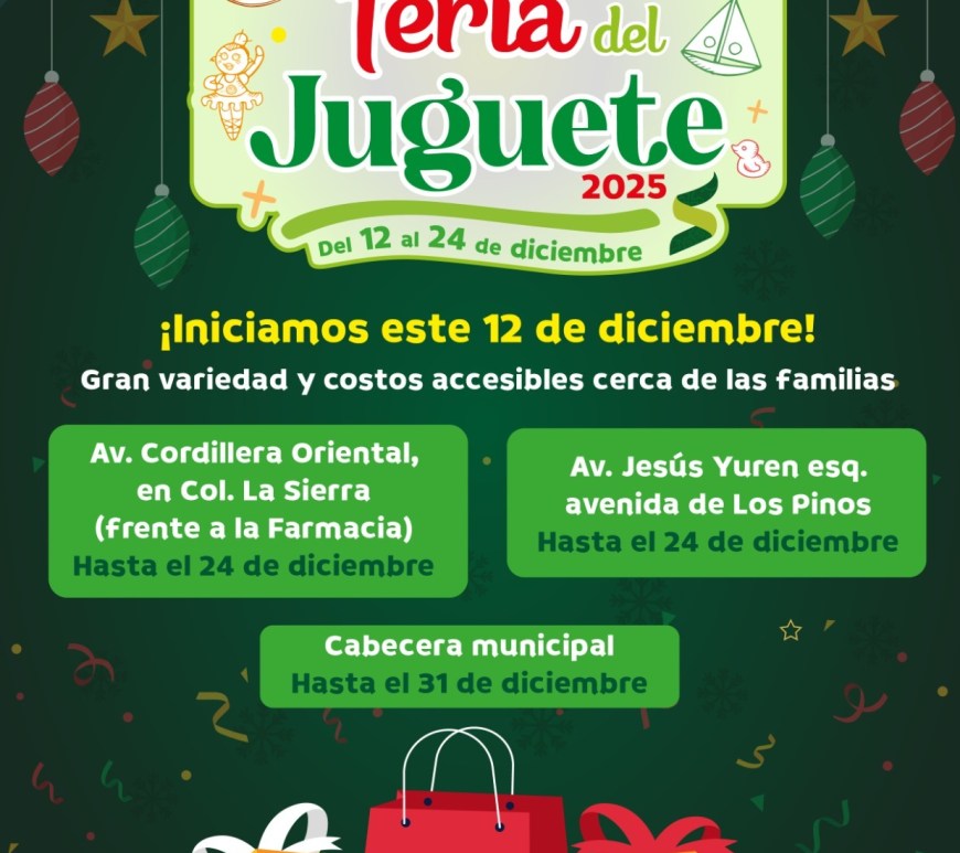 Este impulso por apoyar el comercio local, operará del 12 al 24 de diciembre en varias avenidas, y hasta el 31 de diciembre en la Cabecera Municipal, garantizando cercanía y variedad de productos para las familias. La llegada de la temporada navideña ya se siente en Soledad de Graciano Sánchez con el arranque de la esperada Feria del Juguete 2025, un espacio que cada año … Continúa leyendo Este 12 de diciembre, inicia la feria del juguete en Soledad de G. S. con varias ubicaciones