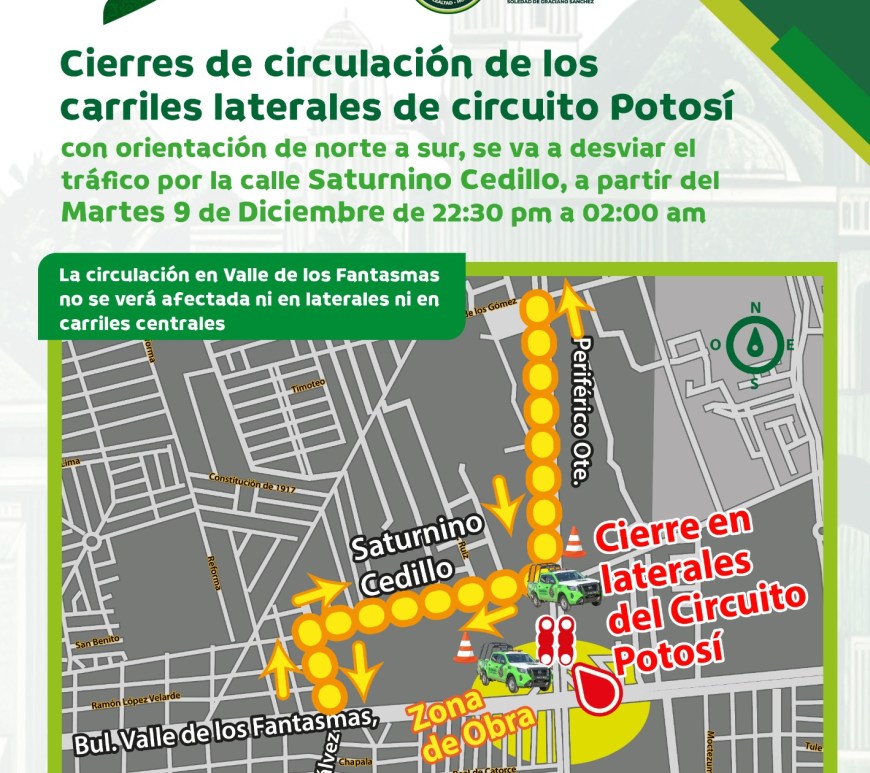 -A partir de este martes, los carriles laterales de Circuito Potosí en sentido norte–sur serán cerrados durante maniobras nocturnas; el flujo se desviará por calle Saturnino Cedillo para garantizar seguridad y orden vial. El Ayuntamiento de Soledad de Graciano Sánchez informa que, ante el avance en la construcción del Puente vehicular en Circuito Potosí y Bulevar Valle de los Fantasmas, se implementarán cierres viales temporales … Continúa leyendo Ayuntamiento de Soledad informa cierres viales nocturnos en la obra del puente vehicular
