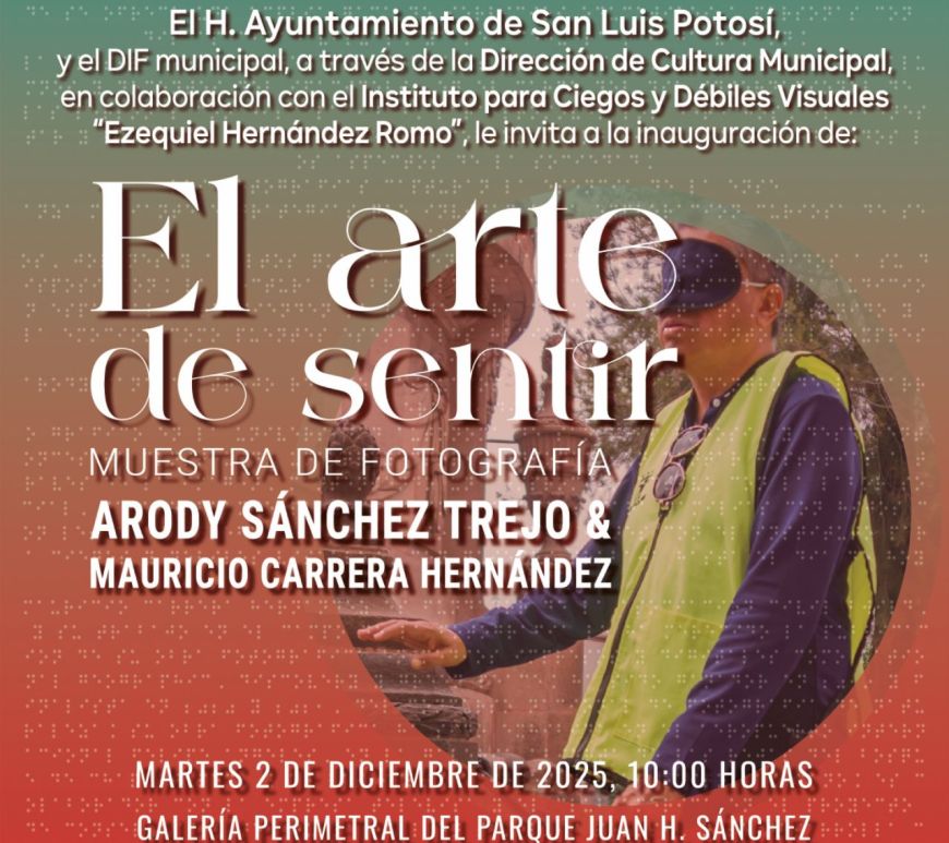 El Gobierno de la Capital de San Luis Potosí y el DIF Municipal, a través de la Dirección de Cultura Municipal, presentarán “El arte de sentir”, una exposición fotográfica que rinde homenaje al trabajo cotidiano del Instituto para Ciegos y Débiles Visuales Ezequiel Hernández Romo (IPACIDEVI) y que forma parte de la conmemoración del Día Internacional de las Personas con Discapacidad. La muestra, integrada por … Continúa leyendo «El arte de sentir”: exposición fotográfica que visibiliza el trabajo del IPACIDEVI será inaugurada en la Galería Perimetral del Parque Juan H. Sánchez.
