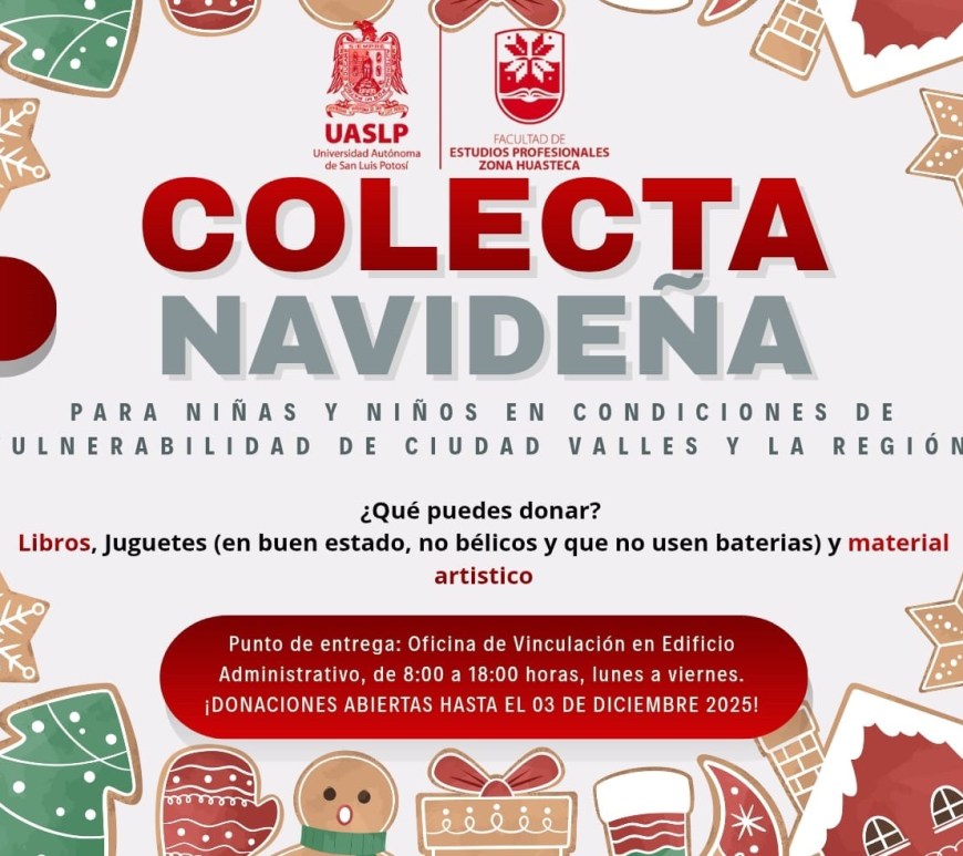 La Facultad de Estudios Profesionales de la Zona Huasteca (FEPZH) Campus Valles invita a la población a participar en la Colecta Navideña de Juguetes 2025, iniciativa dirigida a niñas y niños en situación de vulnerabilidad, con el propósito de entregarles un juguete que no utilice pilas. Así lo informó el director del Campus, Lic. Isaac Lara Azuara. Los donativos se recibirán hasta el 3 de … Continúa leyendo Últimos días para sumarse a la colecta de juguetes en el Campus Valles de la UASLP