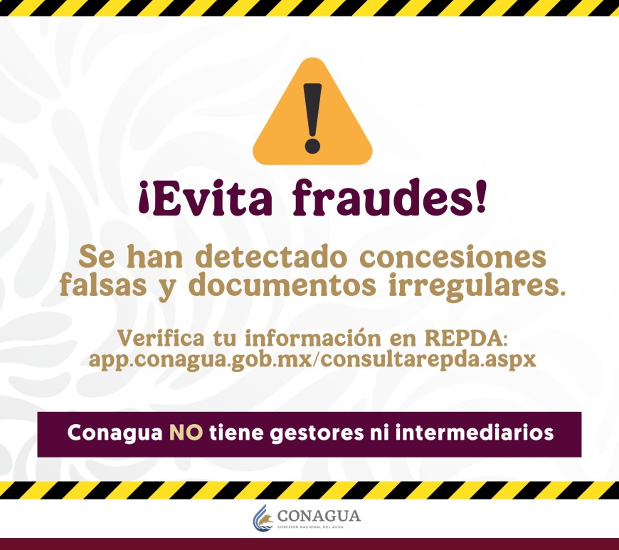 –La Dirección Local llama a los usuarios a verificar la autenticidad de cualquier documento relacionado con el uso de aguas nacionales. La Comisión Nacional del Agua (CONAGUA) informó que se han detectado documentos falsos, como constancias de registro de obra en zonas donde el trámite está suspendido y títulos de concesión que no son auténticos. Estas prácticas buscan engañar a usuarios ofreciéndoles trámites que no … Continúa leyendo CONAGUA advierte sobre documentos falsos relacionados con permisos de agua