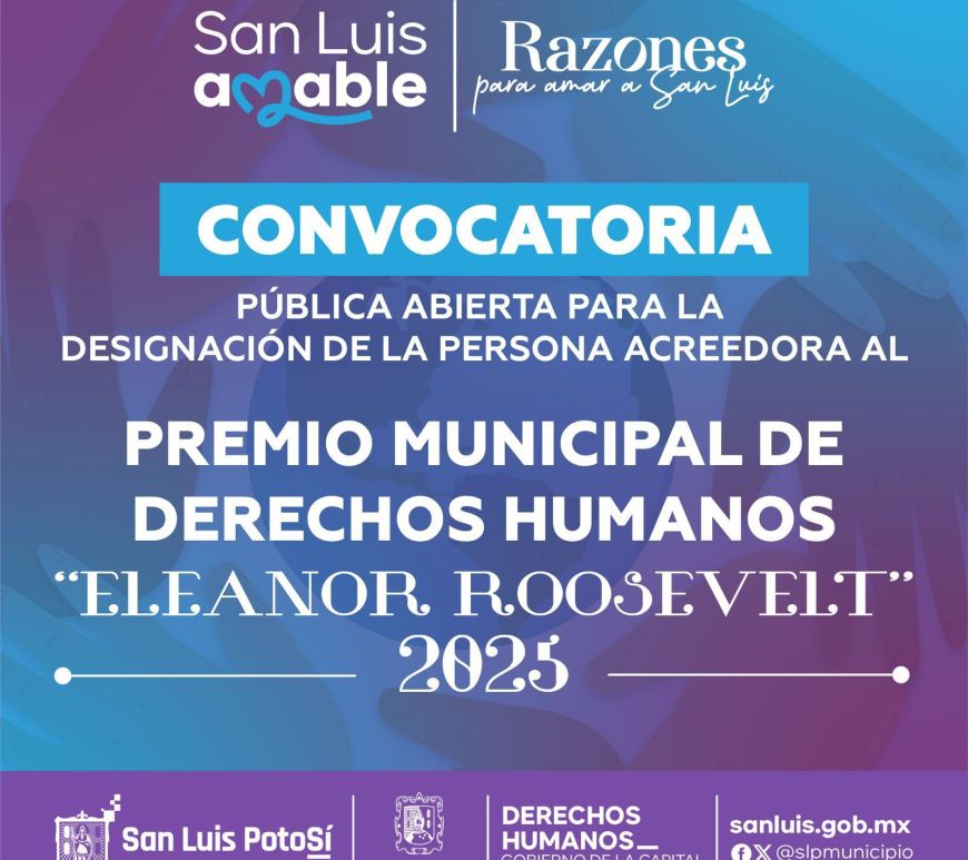 Podrá proponerse a cualquier persona o colectivo con trayectoria en la defensa o promoción de los derechos humanos. El Ayuntamiento de San Luis Potosí, expidió la Convocatoria para participar en el proceso de selección para otorgar el Premio Municipal De Derechos Humanos “Eleanor Roosevelt” 2025, en el que podrá proponerse a cualquier persona o colectivo defensor de los derechos humanos. Los participantes deberán comprobar residencia … Continúa leyendo El Ayuntamiento de la Capital convoca al Premio Municipal de Derechos Humanos “Eleanor Roosevelt” 2025