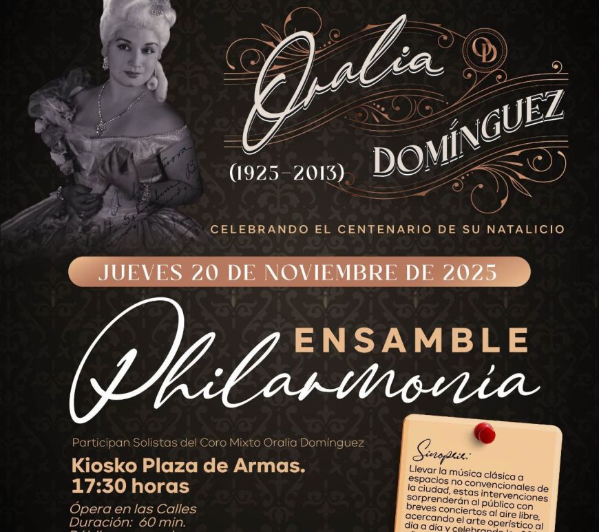 El Gobierno Municipal de San Luis Potosí, a través de la Dirección de Cultura Municipal, continúa fortaleciendo el programa especial de actividades en homenaje a la gran mezzosoprano potosina Oralia Domínguez, en el marco del centenario de su natalicio. Como parte de esta jornada conmemorativa, se invita al público en general a asistir este jueves 20 de noviembre de 2025, en punto de las 17:30 … Continúa leyendo El Gobierno Municipal continúa con las actividades en homenaje a la mezzosoprano potosina Oralia Domínguez