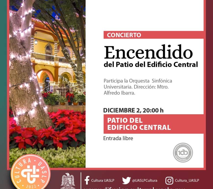 La Universidad Autónoma de San Luis Potosí (UASLP) invita a todas las familias potosinas al tradicional encendido de la iluminación navideña en el Patio del Edificio Central, acto que se realizará el viernes dos de diciembre a partir de las las 20:00 horas. Como parte del espectáculo, la Orquesta Sinfónica Universitaria ofrecerá un concierto en el que interpretará temas como “Suite de El cascanueces”, de … Continúa leyendo Invita la UASLP a la población en general al encendido navideño del patio del Edificio Central
