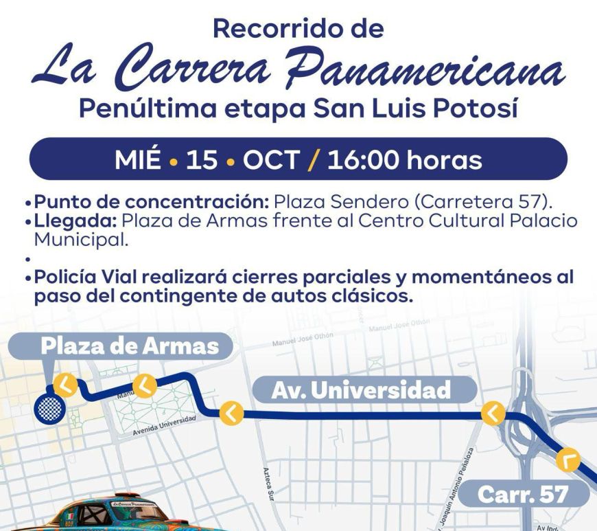 La penúltima etapa de la carrera llegará a la Capital potosina este miércoles 15 de octubre a las 16:00 horas Los autos clásicos ingresarán a Plaza de Armas donde permanecerán en exhibición La Secretaría de Seguridad y Protección Ciudadana de la Capital, a través de la Dirección General de Policía Vial, implementará la tarde de este miércoles 15 de octubre un operativo de seguridad y … Continúa leyendo Policía de la Capital implementará operativo vial por llegada de la Carrera Panamericana 2025
