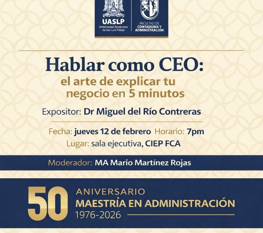 Este jueves 12 de febrero, la Facultad de Contaduría y Administración invita a participar en la charla “Hablar como CEO: el arte de explicar tu negocio en 5 minutos”, que impartirá el Dr. Miguel del Río Contreras, coordinador de la Licenciatura en Mercadotecnia Estratégica, en el marco del 50 aniversario de la Maestría en Administración. La cita es en la Sala Ejecutiva del Centro de … Continúa leyendo FCA-UASLP conmemora 50 aniversario de la Maestría en Administración con conferencia magistral
